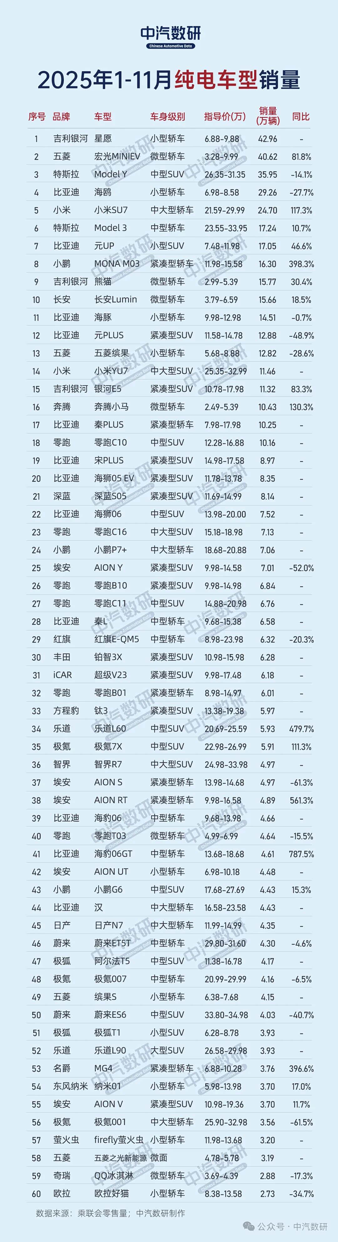 1-11月,国内纯电动车不分级别的零售量榜单。榜单TOP10,除了小米和特斯拉,其他微型/小型车占了6席,便宜的依旧好卖。 另外,2025年截止11月,纯电动车同比增长的较多。而再另一个榜单里,插电混动和增程式大多下降。随着续航里程的不断增加,充电速度的大幅提升,购买新能源车,纯电会成为首选。而插电混动和增程会持续下降。