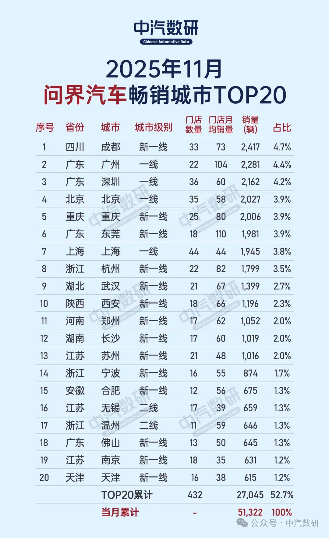 问界在重庆生产,本地可见度非常高。但没想到,四川成都买问界的人才是最多。不仅比大本营重庆多,甚至比北京、广州、深圳这几个一线城市还多。