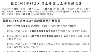【小鹏汽车:2025年第四季度净收益3.8亿元】 小鹏汽车3月20日在港交所公告,本公司于2025年第四季度录得正净收益人民币3.8亿元,并首次在单季度录得正净收益。截至2025年12月31日,在手现金为人民币476.6亿元(68.1亿美元),季度总收入为人民币222.5亿元,按年增加38.2%;季度毛利率为21.3%,较2024年同期上升6.9个百分点;季度汽车毛利率为13.0%,较2024年同期上升3.0个百分点;全年汽车交付量达429,445辆,按年上升125.9%;全年总收入达人民币767.2亿元,按年上升87.7%;全年毛利率为18.9%,按年上升4.6个百分点。