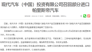 【现代汽车(中国)投资有限公司召回部分进口帕里斯帝汽车】 日前,现代汽车(中国)投资有限公司根据《缺陷汽车产品召回管理条例》和《缺陷汽车产品召回管理条例实施办法》的要求,向国家市场监督管理总局备案了召回计划。召回编号S2026M0043V:自即日起,召回生产日期从2025年8月13日至2026年3月4日的部分进口帕里斯帝汽车,共计357辆。本次召回范围内的车辆,由于座椅防夹功能范围设定不足,可能在第二、三排电动座椅折叠时,无法检测到乘员并发生夹住情况,且座椅靠背无法回位,增加乘员受伤风险,存在安全隐患。(财联社)
