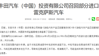 【丰田汽车(中国)投资有限公司召回部分进口雷克萨斯汽车】 日前,丰田汽车(中国)投资有限公司根据《缺陷汽车产品召回管理条例》和《缺陷汽车产品召回管理条例实施办法》的要求,向国家市场监督管理总局备案了召回计划。召回编号S2026M0044V:自即日起,召回2014年9月29日至2017年9月6日期间生产的部分进口雷克萨斯RC F汽车,共计56辆。本次召回范围内部分车辆,由于对低压燃油泵中叶轮的材料选型不当,叶轮可能会在燃油作用下发生膨润变形,与低压燃油泵壳体发生干涉,导致低压燃油泵工作不良。极端情况下,可能造成车辆行驶中熄火,存在安全隐患。(财联社)