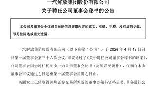 【一汽解放:聘任杨丽为公司董事会秘书】 一汽解放4月17日公告,公司当天召开第十届董事会第三十六次会议,审议通过了《关于聘任公司董事会秘书的议案》,公司董事会同意聘任杨丽为公司董事会秘书,任期自本次董事会审议通过之日起至第十届董事会届满之日止。