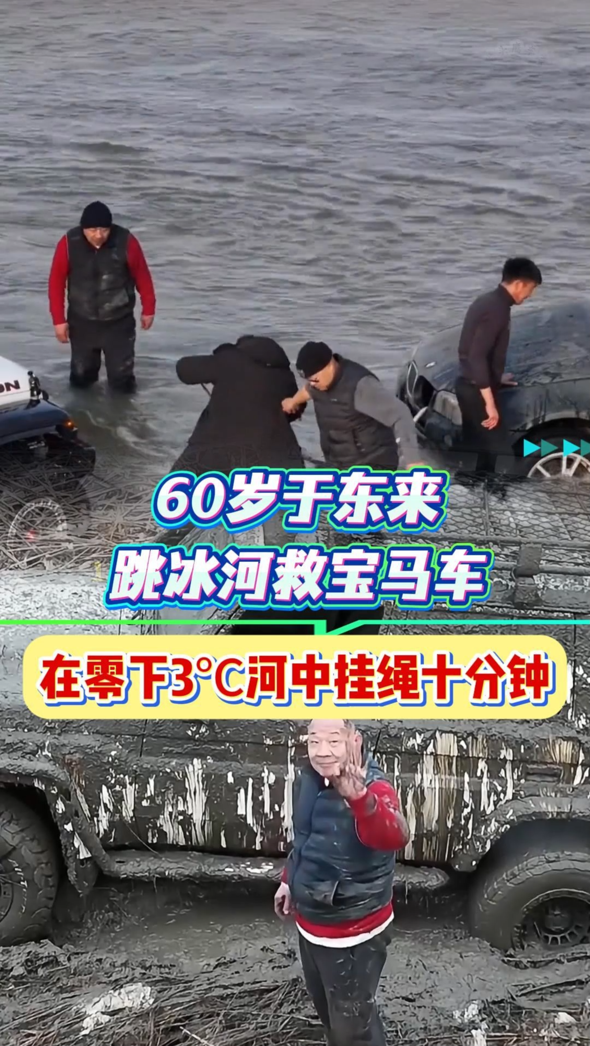 60岁于东来跳冰河救宝马车!在零下3℃河中挂绳十分钟