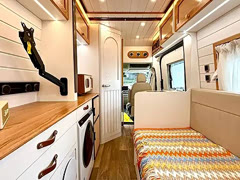 由英国改装厂商萨塞克斯露营车公司(Sussex Campervans)基于起亚汽车PV5纯电MPV改装的升降顶房车。车内右侧是简单的厨房和储物柜等设施,左侧则是座椅,可以放平拼成一张舒适的床。