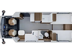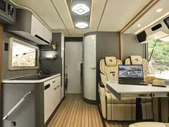 经典英式房车布局,车内提供主副驾驶座椅2个安全带,即上牌人数为2.虽然车长6.20m,不过由于少了乘坐座椅的需求,内部客厅活动空间和睡卧空间显得非常大。