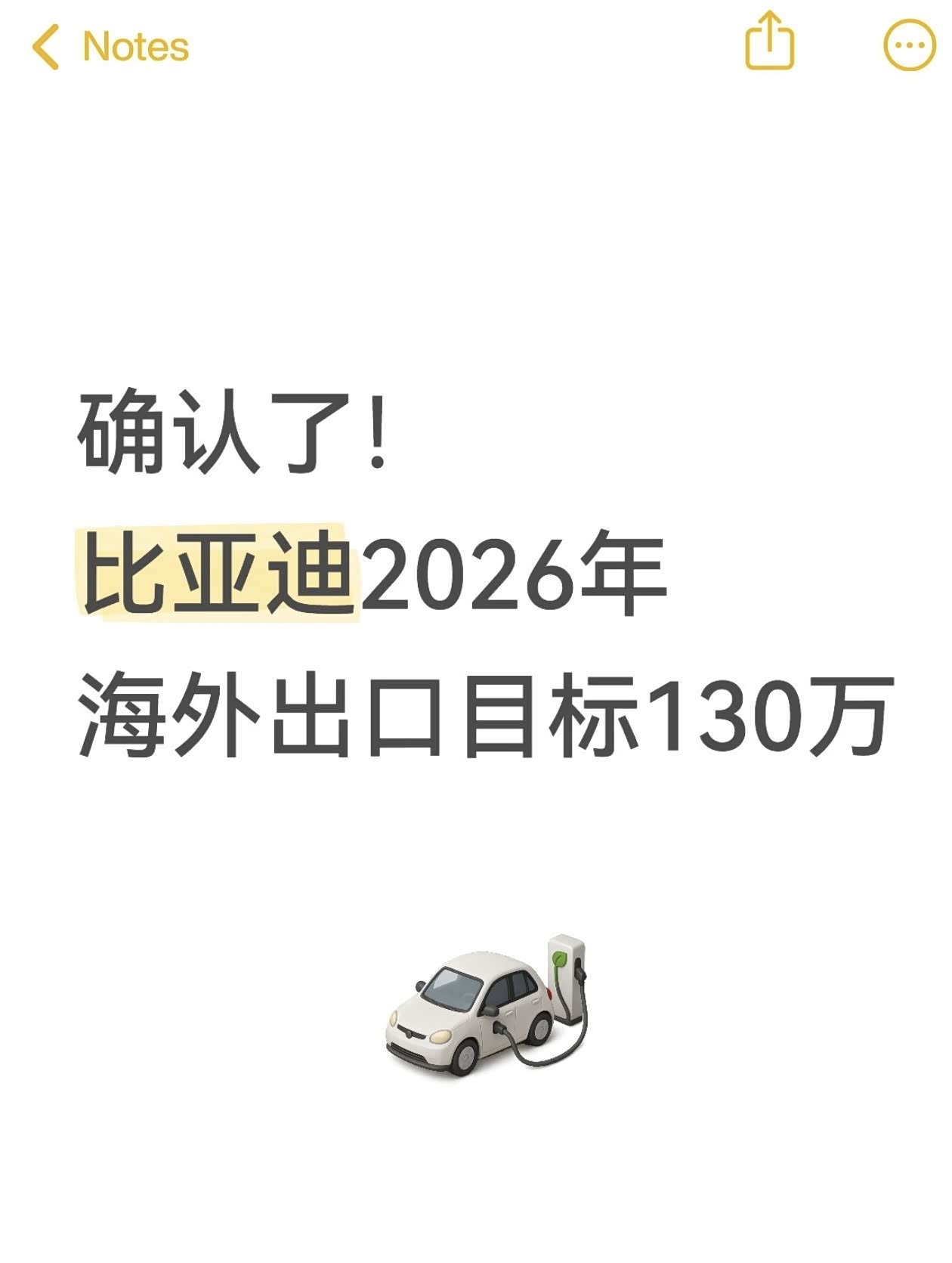 根据比亚迪李云飞的消息,比亚迪2026年海外出口目标是130万,这个数据还是比较稳妥和靠谱的。 考虑到2025年比亚迪出口了100万辆汽车,那么2026年海外增加30万也不是啥问题,现在海外市场还有很大的发展空间,竞争程度远不如国内。比亚迪靠着庞大的渠道、8艘投入使用的运输船,只要没有政治因素影响,我认为这个目标没问题。 比亚迪在海外也有工厂,本身技术又领先,面对海外竞争者,说一句降维打击也不过分。而且,品牌力也比国内强太多,所以我很看好王传福之前定的,要在海外再打造一个比亚迪。