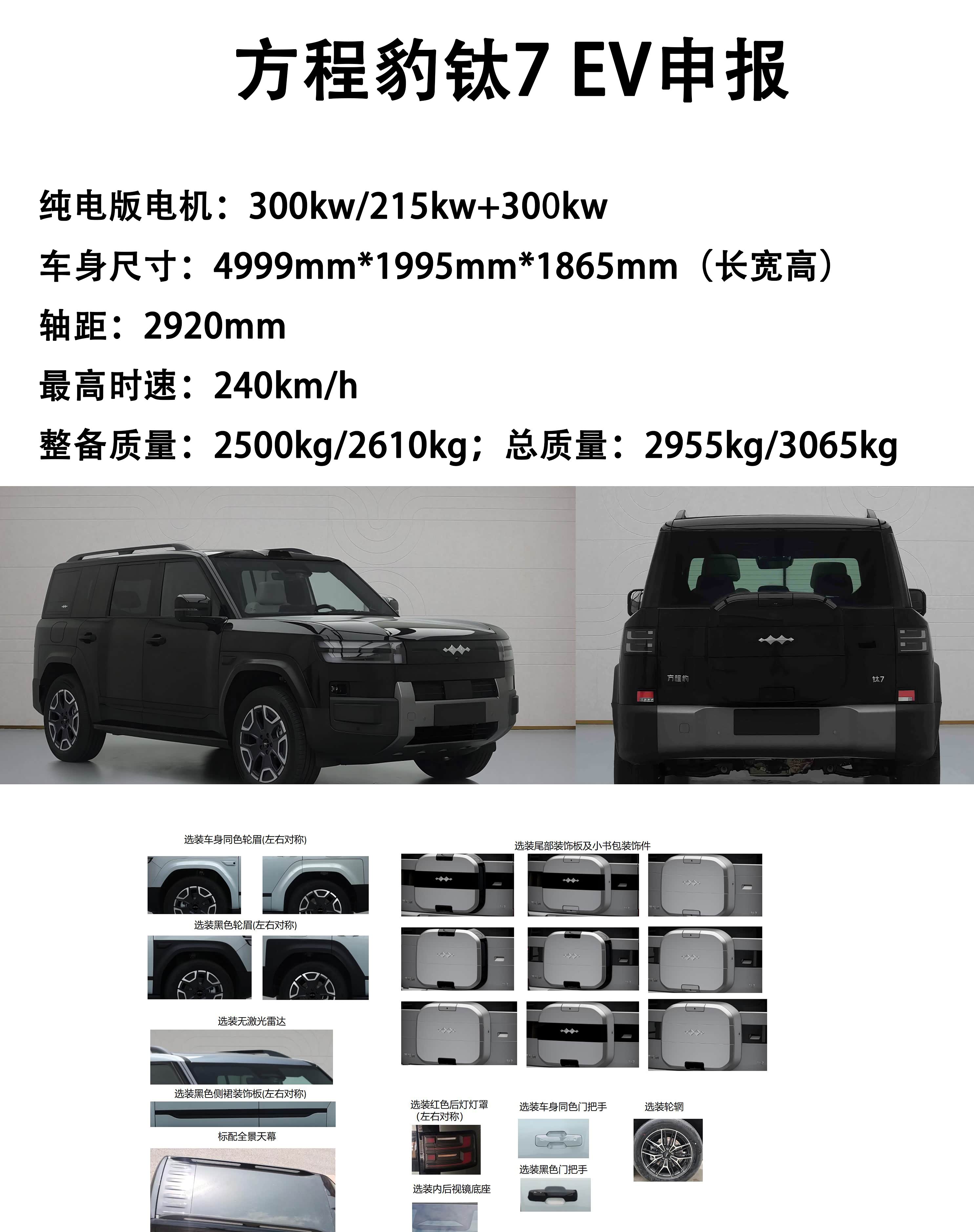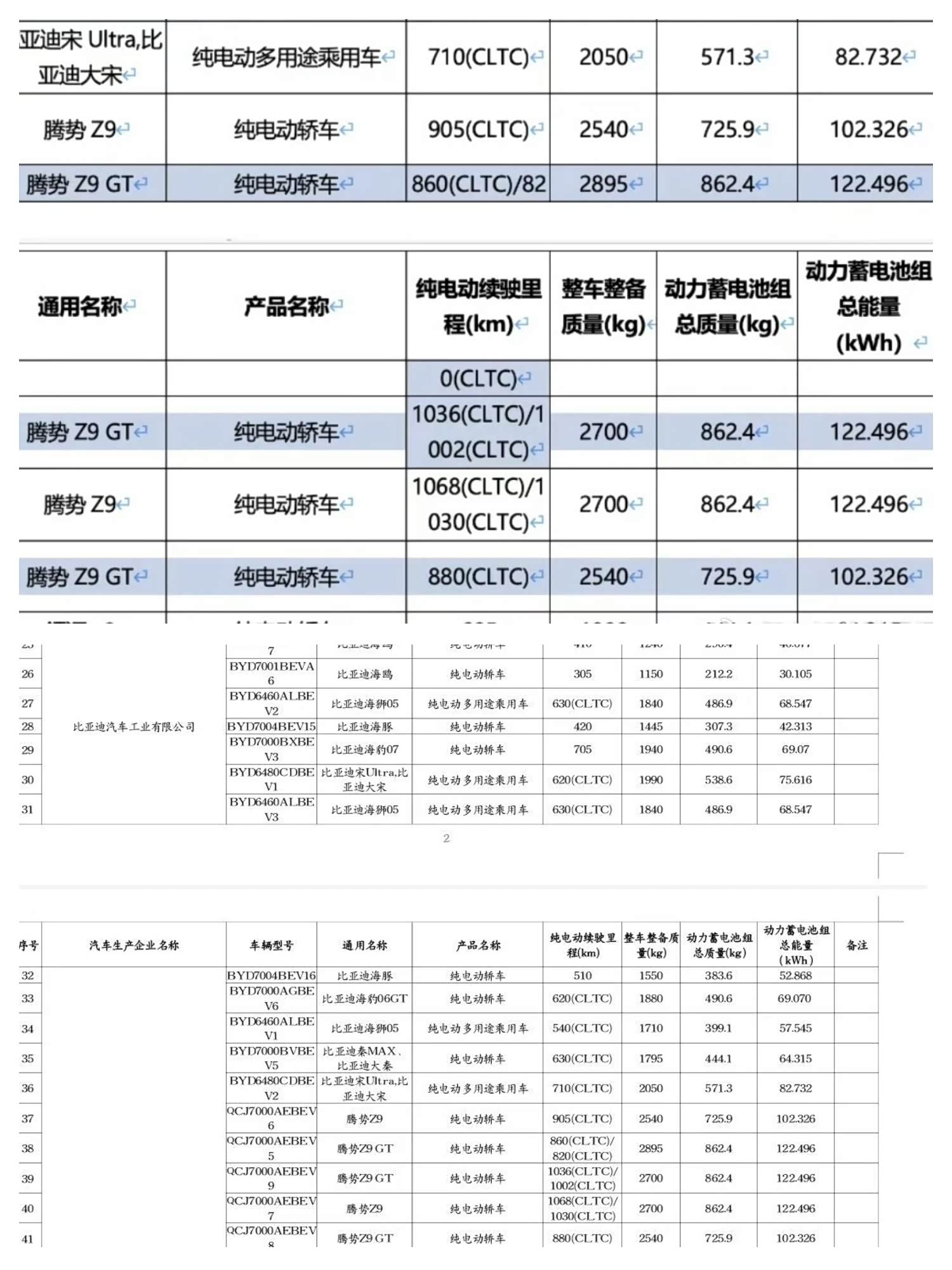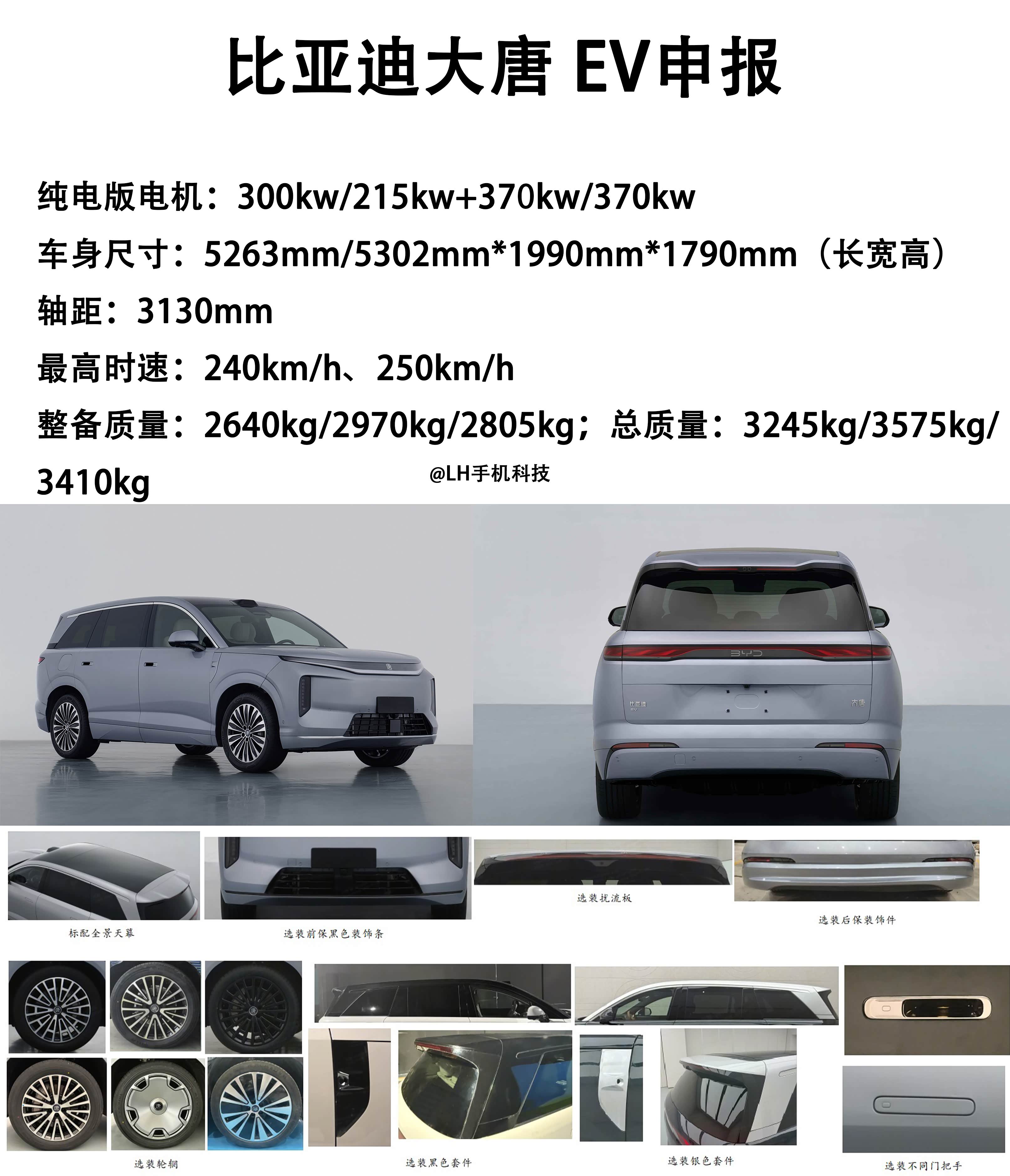 在本期工信部申报中,比亚迪的新车只有三款,分别是大唐EV、钛7 EV和D9 EV,其他车型之前都亮相过。 比亚迪大唐纯电版,车身尺寸5263mm/5302mm*1990mm*1790mm,轴距3130mm。电机有300kw单电机、215kw+370kw双电机、370kw单电机三个版本,极速240KM/h。整备质量,整备质量:2640kg、2970kg、2805kg。 其他方面,续航还是挺长的,技术也不用担心,颜值方面精简了很多,和概念车很像,就差内饰没公布了,整体来说,感觉这次是稳了。 方程豹钛7 EV版本,尺寸方面4999mm*1995mm*1865mm,轴距2920mm。电机方面,有300kw单电机、215kw+300kw双电机两个版本,整备质量整备质量:2500kg、2610kg。现在唯一在意的就是纯电续航以及它的技术配置。 还有腾势D9 EV版申报,它的尺寸5250mm*1960mm*1900mm;轴距3110mm。有340kw单电机、340kw+70kw双电机两个配置,整备质量为2915kg、3015kg。车辆不轻,估计纯电续航应该是有惊喜的,充电速度也会很快。