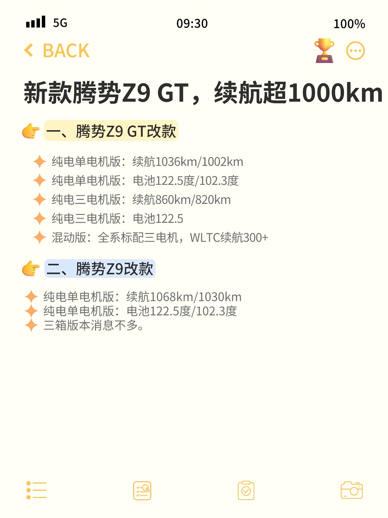 超过1000公里的续航,现在还有里程焦虑吗? 新款腾势Z9 GT单电机版有122.5度电池和102.3度电池版本,续航里程1036km和1002km,三电机版本续航860km,122.5度的电池。腾势Z9三箱版同样的电池容量,最长1068km。混动版全系三电机架构,纯电续航400km左右差不多。 看这个续航,肯定是升级了更高压的平台架构,升级了兆瓦闪充这些技术。续航长、补能快,外观增加新配色,内饰新的设计,这下没得说了,这一代产品基本补足了短板,宣传跟上还是很有潜力的。 我一直觉得腾势Z9 GT是目前国产猎装车颜值天花板,期待这次升级版的发布。
