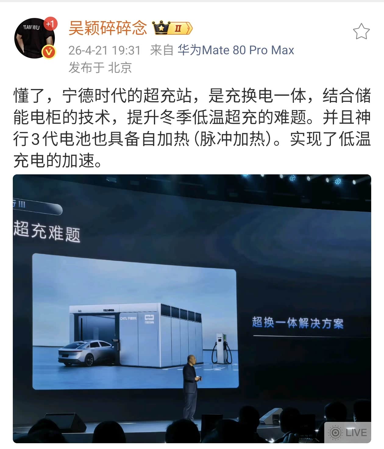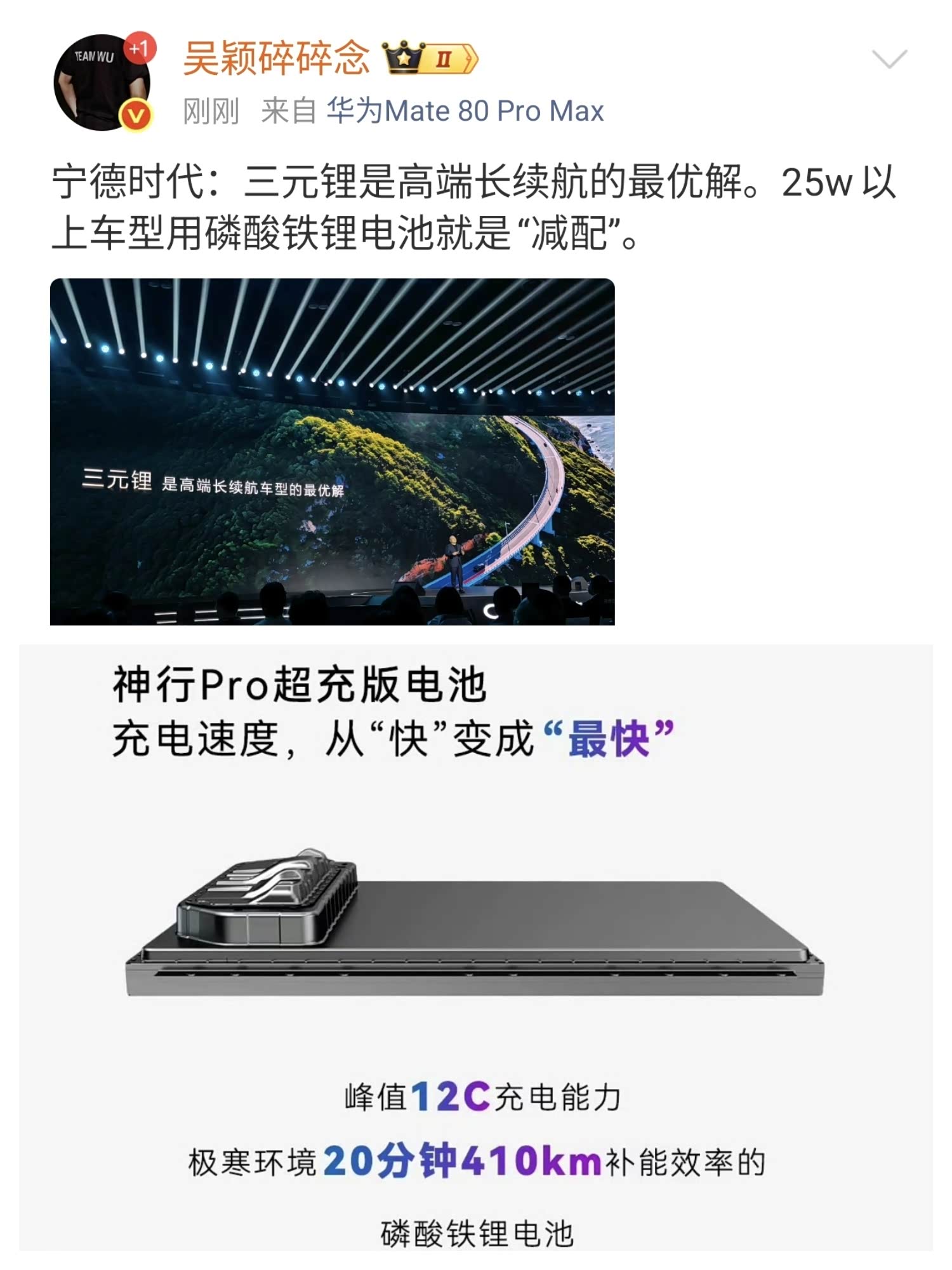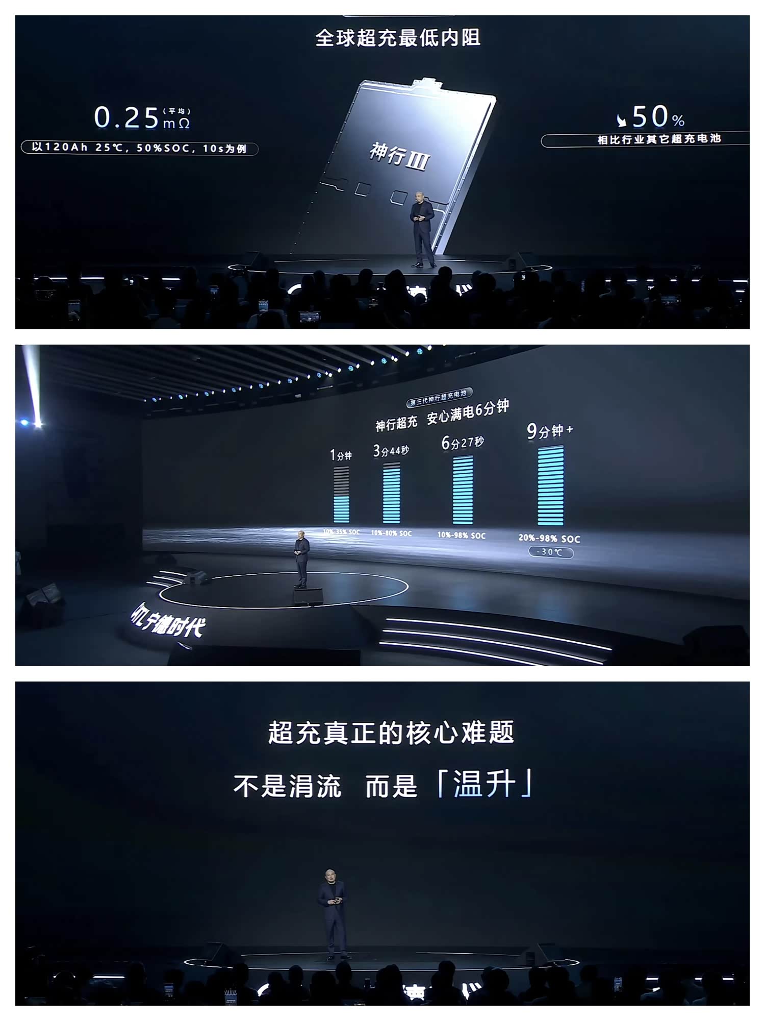 宁德时代发布第三代神行电池,主要解决了低温充电和常温充电的性能。 常温环境下,10%充至35%只需要1分钟;10%充至80%只需要3分44秒;10%充至98%只需要6分27秒。零下30℃极寒环境,20%充至98%只需要9分钟多。这些数值的确超过了隔壁比亚迪闪充和吉利金砖电池,说一句遥遥领先不过分。 但问题来了,现在有没有实车展示?多久能大规模量产呢?我们不能只看PPT,最终用户看的是实测啊。 我记得去年宁德时代的领导说闪充伤电池隔两天就发布峰值12C功率,充电5分钟续航520km的电池。但去年发布的12C电池,至今没看到哪个车型有。 发布会还拉踩磷酸铁锂,说25万以上车型用磷酸铁锂是减配,这一句话得罪多少厂商啊?你发布的超充电池不也是磷酸铁锂?自己把自己打成低端啊? 发布会真的难绷。好好的发布自家产品不好吗?非要搞拉踩。