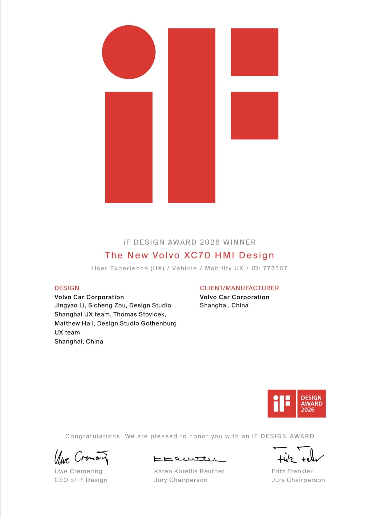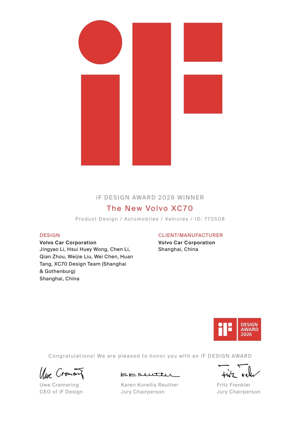#沃尔沃XC70获两项iF设计大奖 在刚刚揭晓的2026年iF设计大奖评选中,沃尔沃全新XC70其整车设计与HMI设计一举获两项iF设计大奖。 凭借卓越的产品实力,从全球66个国家/地区超11,000件参赛作品中脱颖而出。 沃尔沃XC70通过斯堪的纳维亚设计美学、人性化智能科技与超混安全性能深度融合,生动诠释了“安全超混旗舰”独特魅力。