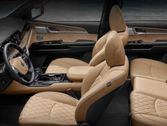 起亚霸锐。座椅采用的是真皮材质包裹,提升了内饰的档次感,而主副驾驶支持电动调节座椅,前后排座椅支持加热功能,而座椅采用的是2+3+2的7座布局,并且内饰可以自动调节空调,而在配置方面,起亚霸锐配备了中央差速锁,空气悬挂,陡坡缓降,上坡辅助,倒车影像,定速巡航,无钥匙启动系统,无钥匙进入系统,胎压报警,前排安全带未系提醒,制动力分配以及刹车辅助等。