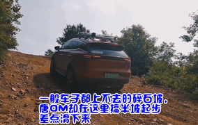一般车子都上不去的碎石坡,唐DM却在这里搞半坡起步,差点滑下来