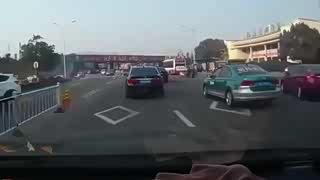 摩托车男子一脚踢向小车,车祸瞬间发生,路怒症真可怕