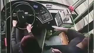 监控:遇到有人抢方向盘,公交女司机临危不乱