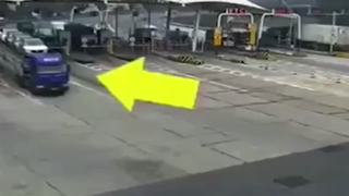 半挂车一个甩尾, 收费站内感觉像是世界末日了, 监控拍下全过程!