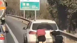 女司机总有神奇操作,高速路上推着车赶往加油站!