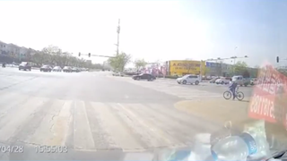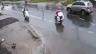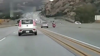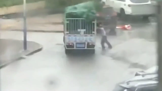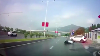 摩托车撞倒路人头也不回,不料下一秒被大货车送了回来!