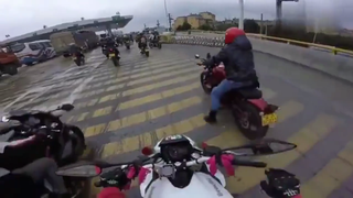 摩托车司机刹不住车,整个侧翻倒在地,不料旁边就有3个交警