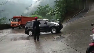 路况太差轮胎打滑,货车司机很无奈,上坡弯道还下着小雨!