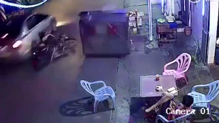 摩托车酒驾,蛇形撞上占道烧烤摊摔倒,被路过车撞击头部
