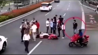车祸现场看热闹,小伙从配角升级为主角,监控拍下这戏剧性的画面