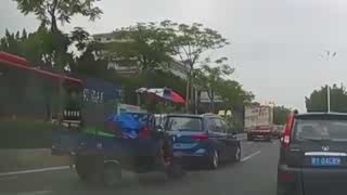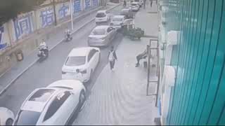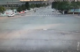 三轮车与轿车碰撞后逃逸,拖行轿车司机数十米,监控拍下惊魂一刻