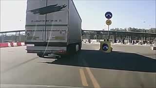 太危险了, 货车过高速路口不减速, 直接撞上护栏
