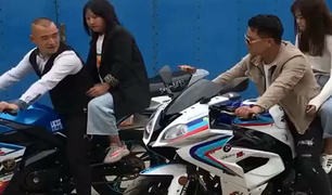 两老司机骑摩托车比动力,可把两个妹子折腾坏了,差点被甩下去!