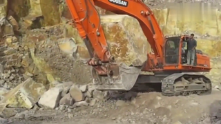 挖掘机将巨石放到卡车车厢的一瞬间,卡车司机吓得从驾驶室跑出