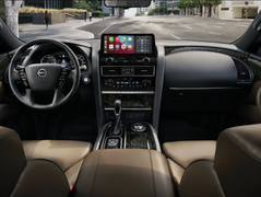 目前,日产新款途乐已在美国市场正式开售,新车海外市场起售价为48,900美元(约为32万人民币),并将于近期陆续开启交付工作。外观方面,全新日产途乐依旧保持了家族式的设计语言,前脸部分超大尺寸的熏黑多横幅式进气格栅配合C字型分体式LED头灯组,极具辨识度。高大的车身也为其增添了硬朗的气息,大气十足。 内饰方面,新车还是采用了机械指针+行车电脑液晶屏的传统仪表组合,并没有与时俱进的采用全液晶仪表,这一点略显老气,不过好在其中控位置配备了一块12.3英寸悬浮式液晶屏,也算是整车内饰的科技担当了。此外,内饰多处加入了仿木纹材质饰板进行点缀,也是彰显了豪华的身份定位。据悉,新车动力将继续搭载5.6L V8自然吸气发动机,最大功率可达298kW,峰值扭矩560N·m,传动系统将匹配7速自动变速箱,并带有集成拖车制动控制器和拖车摇摆控制。
