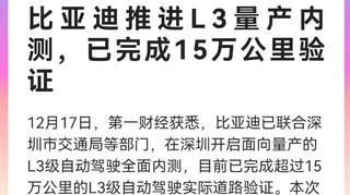 比亚迪推进自动驾驶内测!据了解,比亚迪已联合深圳市交通局等部门,在深圳开启面向量产的L3级自动驾驶全面内测,目前已完成超过15万公里的L3级自动驾驶实际道路验证。比亚迪推进自动驾驶内测以安全为核心,覆盖深圳开放的高快速路,兼顾雨天、夜间、施工等不同场景工况,全面验证L3级产品成熟度和可靠性,为国家L3级自动驾驶落地提供实践依据。 据悉,2023年比亚迪就已获得国内第一张L3级自动驾驶测试牌照,并于2024年成为国家四部门首批L3级自动驾驶准入及上路通行试点的9家企业之一。