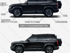 指导价18.59万元,深蓝G318四驱旷野版正式上市。 此次推出的四驱旷野版为补齐深蓝G318产品点位空缺的补位产品,定价与两驱旷野版相同,但部分配置甚至不及两驱旷野版,相较在售的四驱远山版和秘境版在底盘配置上又有硬件差距,定位应该是硬派风格公路四驱SUV。 外观部分,深蓝G318四驱旷野版仅提供峡谷黑一款配色,造型相较在售的两款四驱版车型简约了很多,前格栅警示灯、机盖扩展平台、车顶射灯/露营灯、PLUS行李架、后警示灯、前后拖钩、轮毂轮胎都进行了减配。 内饰部分,深蓝G318四驱旷野版仅提供密林黑配色,方向盘加热、座椅舒适配置、氛围灯、天窗隔音玻璃灯均有减配。 深蓝G318四驱旷野版动力与在售车型保持一致,依旧是1.5T增程器+131/185双电机,匹配35.07kWh磷酸铁锂3C快充电池。