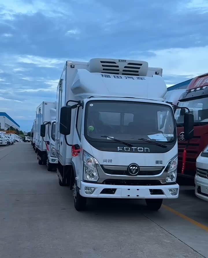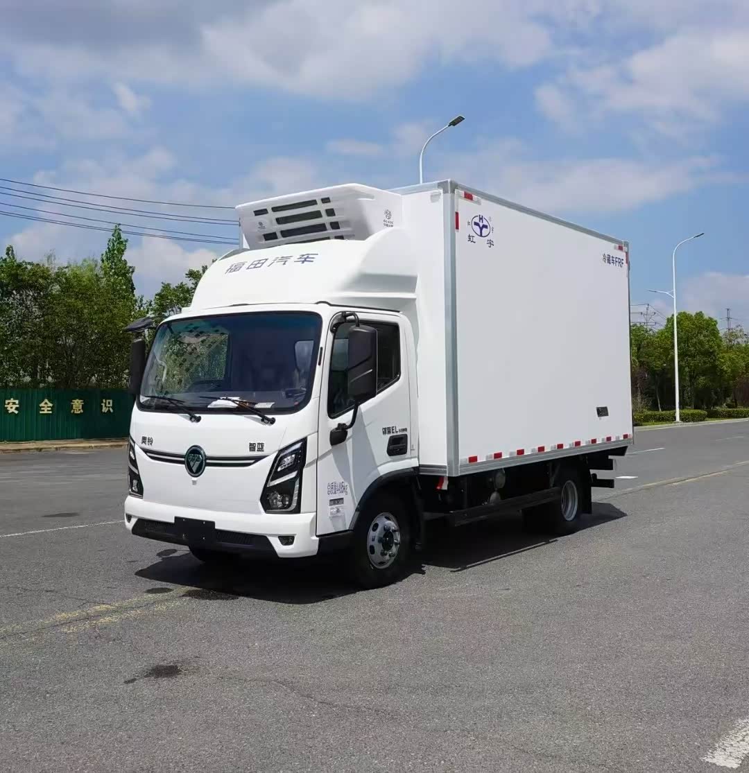 福田领航G5EV新能源冷藏车(国六) BJ5045XLCEVZ6 整车尺寸:5995*2260*3250(mm) 箱体尺寸:4085*2100*2100(mm) 北汽福田发电机(FTTB065B) 宁德时代电池:100.46kwh,续航里程:280公里 1880mm驾驶室、气囊减震座椅、全包内饰,多功能方向盘、10.25寸双联断码屏、7.00R16轮胎,电动门窗+中控锁+遥控钥匙、定速巡航、电动空调、一体电加热后视镜、4.5T电驱桥,板簧:3/5+2。 轴距:3360mm