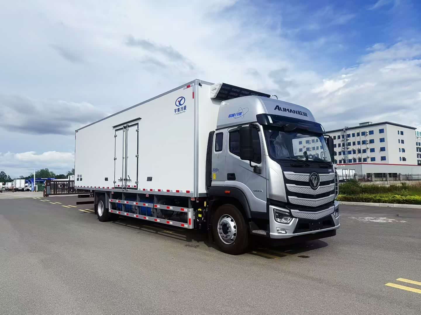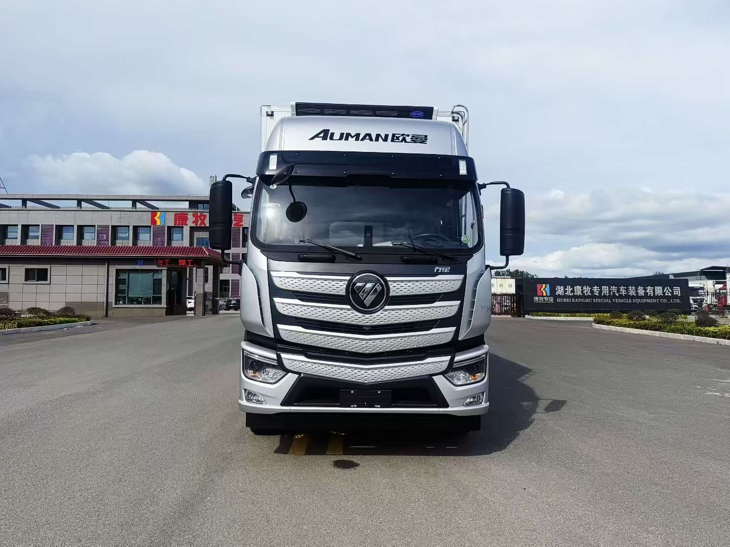9.6米冷藏车-福田欧曼行星康机300 整车尺寸:12000×2600×3990(MM) 厢内尺寸: 9600×2430×2500(MM) 容积:58立方 【底盘配置】 发动机型号:福康A7NS6B300 变速箱:8JS125TA法士特8档变速箱 轮胎:275/80R22.5 真空胎 轴距:7300 康机300马力,法士特8档,底盘配置: 高顶双卧平地板,多功能方向盘、铝合金储气筒、前后鼓式制动器、10/10+3板簧、皮革座椅气囊式减振座椅、电动门窗升降、中控锁、电动调节,电加热除霜外后视镜、冷暖一体,电动空调、有定速巡航、下置气喇叭、有自动大灯、7吋彩屏仪表L275/80R22.5-18PR-KT、LED大灯、110A发电机和180Ah蓄电池、MP3、凸后围