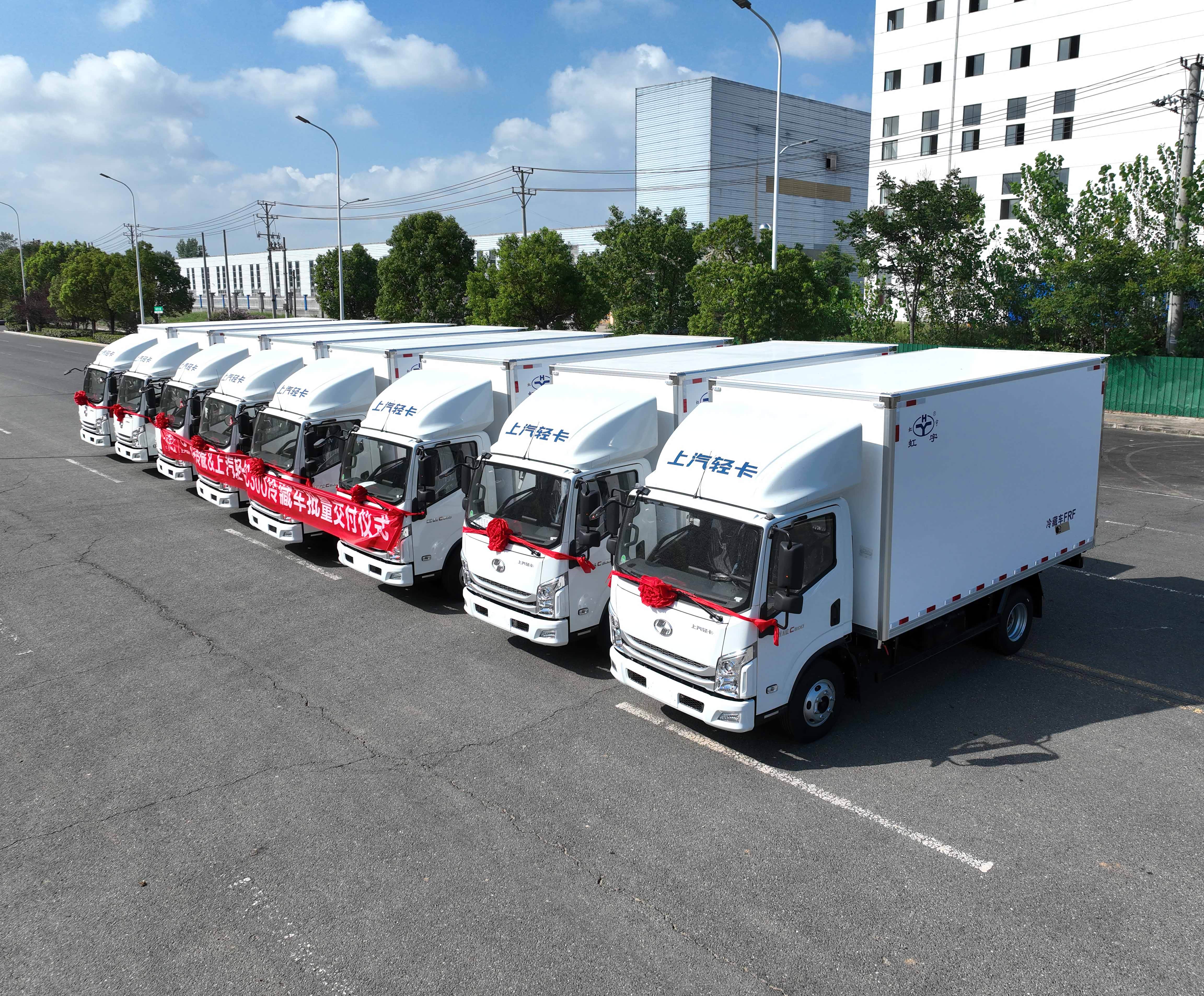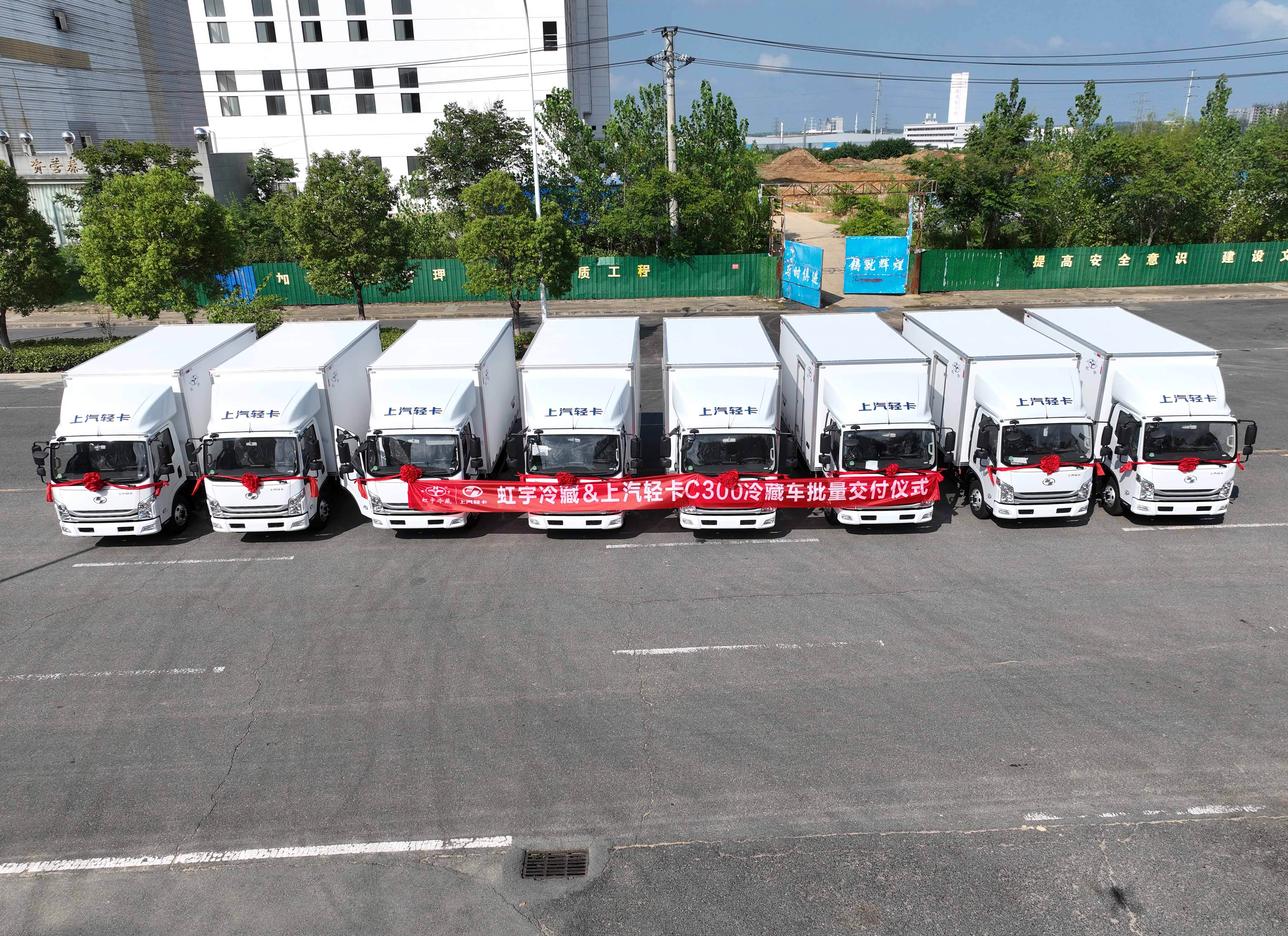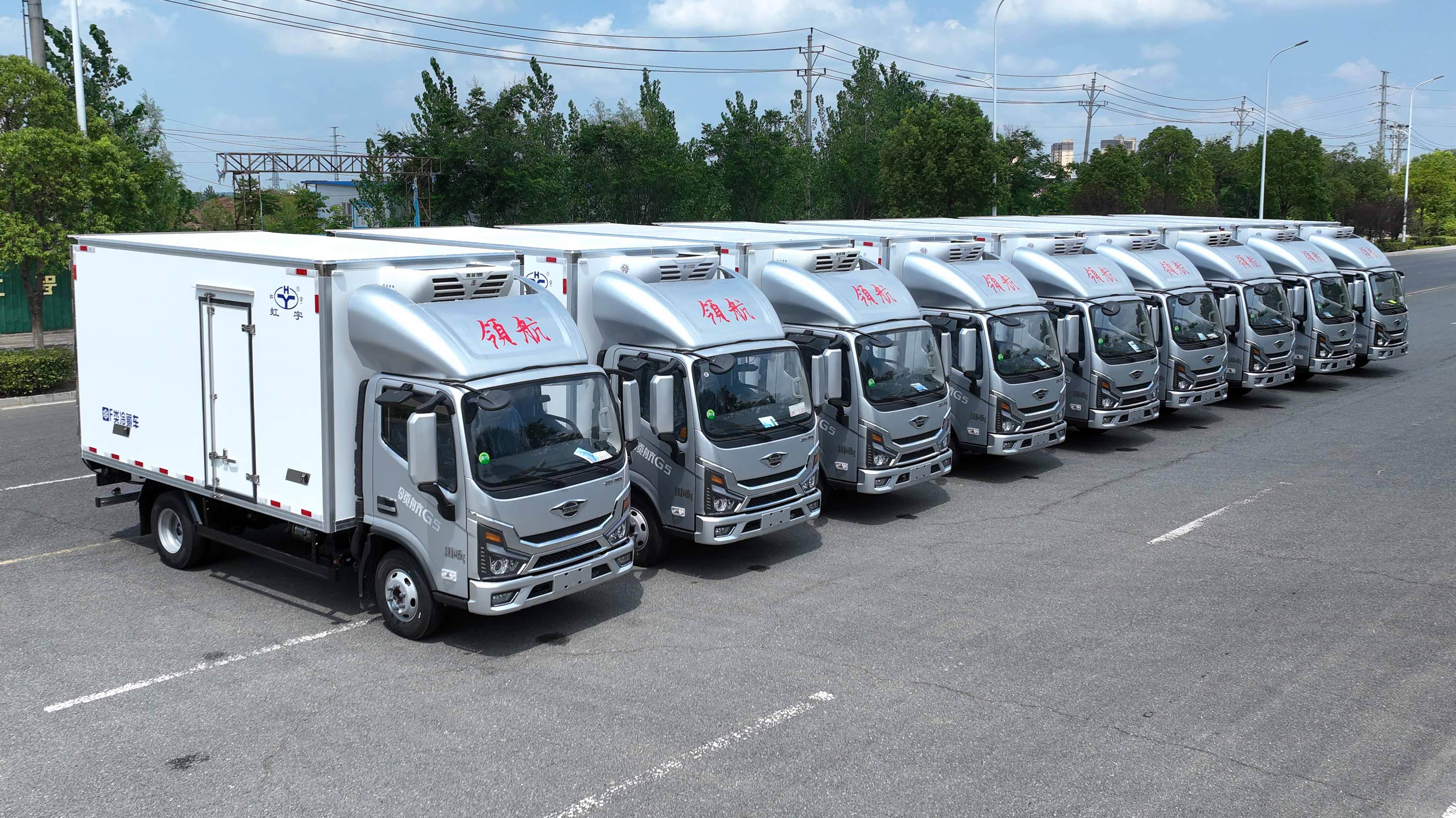 8台上汽跃进C300蓝牌4.2米冷藏车批量发车~