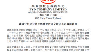 近日,小编获悉。比亚迪股份有限公司(简称:比亚迪)发布公告称,分拆所属子公司比亚迪半导体股份有限公司至创业板上市申请获得深圳证券交易所受理。公告称,本次分拆尚需满足多项条件方可实施,包括但不限于获得香港联合交易所有限公司同意,通过深圳证券交易所审核及中国证券监督管理委员会同意注册,存在重大不确定性。公司将根据相关事项的进展情况,严格按照法律法规的规定与要求,及时履行信息披露义务,敬请广大投资者注意投资风险。