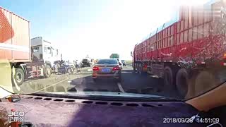 老捷达高速错过出口急刹,视频车躲避被后车直接追尾
