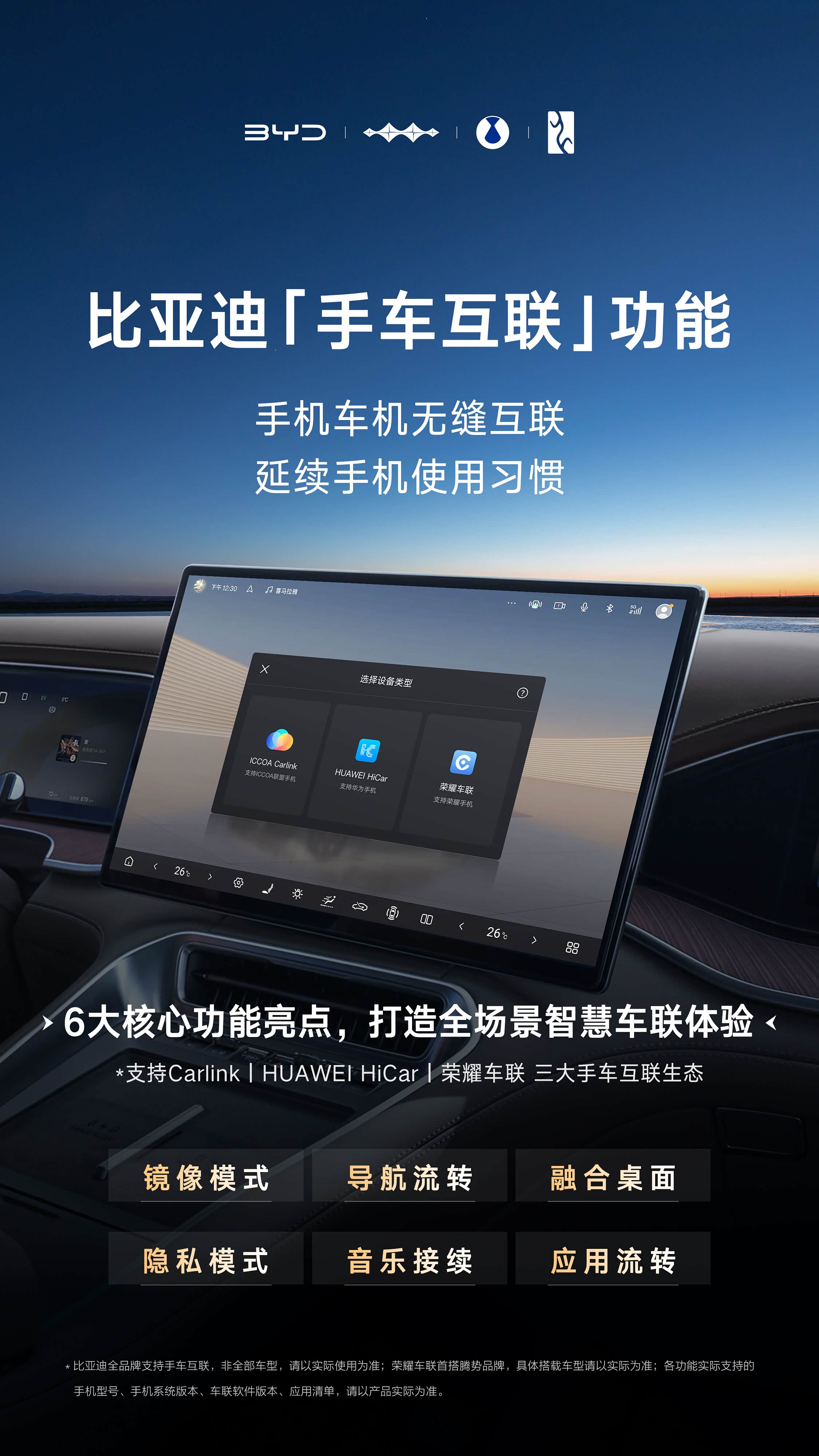 今天的好消息属于全体比亚迪车主!比亚迪官宣全品牌上线「手车互联」功能,并且打通中国所有主流手机品牌,比如华为手机的一屏双终端、荣耀手机的应用流转、OPPO的智慧车控、vivo的音乐断续、小米手机的导航流转等等,这不就是把所有手机品牌的好功能都集中给了比亚迪车机系统了吗?这下车主使用手机的习惯都能无缝衔接到车机上、实现数据共享! 要我说,还得是比亚迪车主幸福,前段时间,比亚迪手机 NFC 车钥匙、 手 机 UWB 车钥匙已经实现了兼容全球主流手机品牌,现在手车互联功能更是全面兼容中国所有主流手机品牌,这项功能也会覆盖比亚迪全品牌,所有车主都能受益,试问谁有实力一统车机互联江湖?谁有眼力实现以用户为中心的开放生态战略?这份行业领先的智能化技术研发能力及生态战略合作理念,唯有比亚迪!