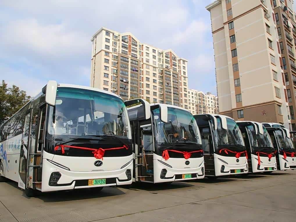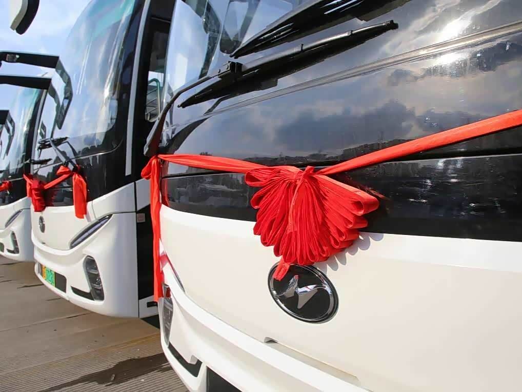 共筑区域出行新生态!批量苏州金龙新V系客车交付张家港港城汽运