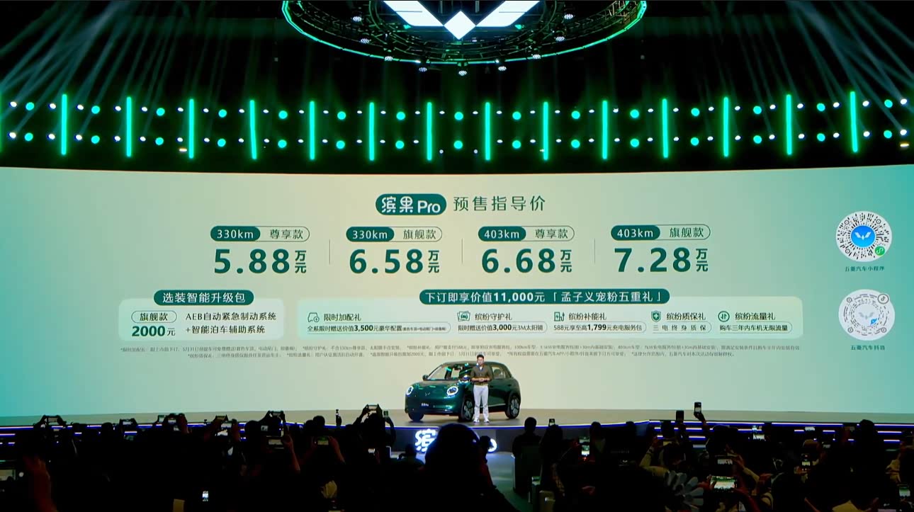 4月14日,五菱缤果Pro正式开启预售,预售价5.88万元起。发布会上,缤果家族全球代言人孟子义再次为这台“精致缤纷座驾”打Call,双方三度携手,颜值与实力双双在线。 缤果Pro定位5门5座精品代步车,新复古主义美学外观搭配四款摩登晶彩车色,内饰采用水韵浮岛中控+甜品色系,云感座椅、美颜柔光镜、美甲友好开关等细节,精致到指尖。 续航和动力同样能打:提供330km/403km两个版本,一周一充通勤无压力;支持3C快充,30%-80%电量仅需15分钟,还带3.3kW对外放电。十二合一电驱最大功率65kW,最高车速130km/h,高速也能轻松应对。 智能辅助方面,540°高清全景影像+自动泊车+AEB紧急制动,配合5.35米超小转弯半径,新手秒变老司机。空间利用率高达84.8%,新增30L前备厢、25处储物巧思、电动尾门等,贴心设计无处不在。 安全上,采用“中国十佳车身”同架构,72%高强钢、四气囊,神炼电池0自燃。缤果家族累计销量已超70万辆,品质有口皆碑。今晚预售已开启,这台孟子义同款座驾,你心动了吗?