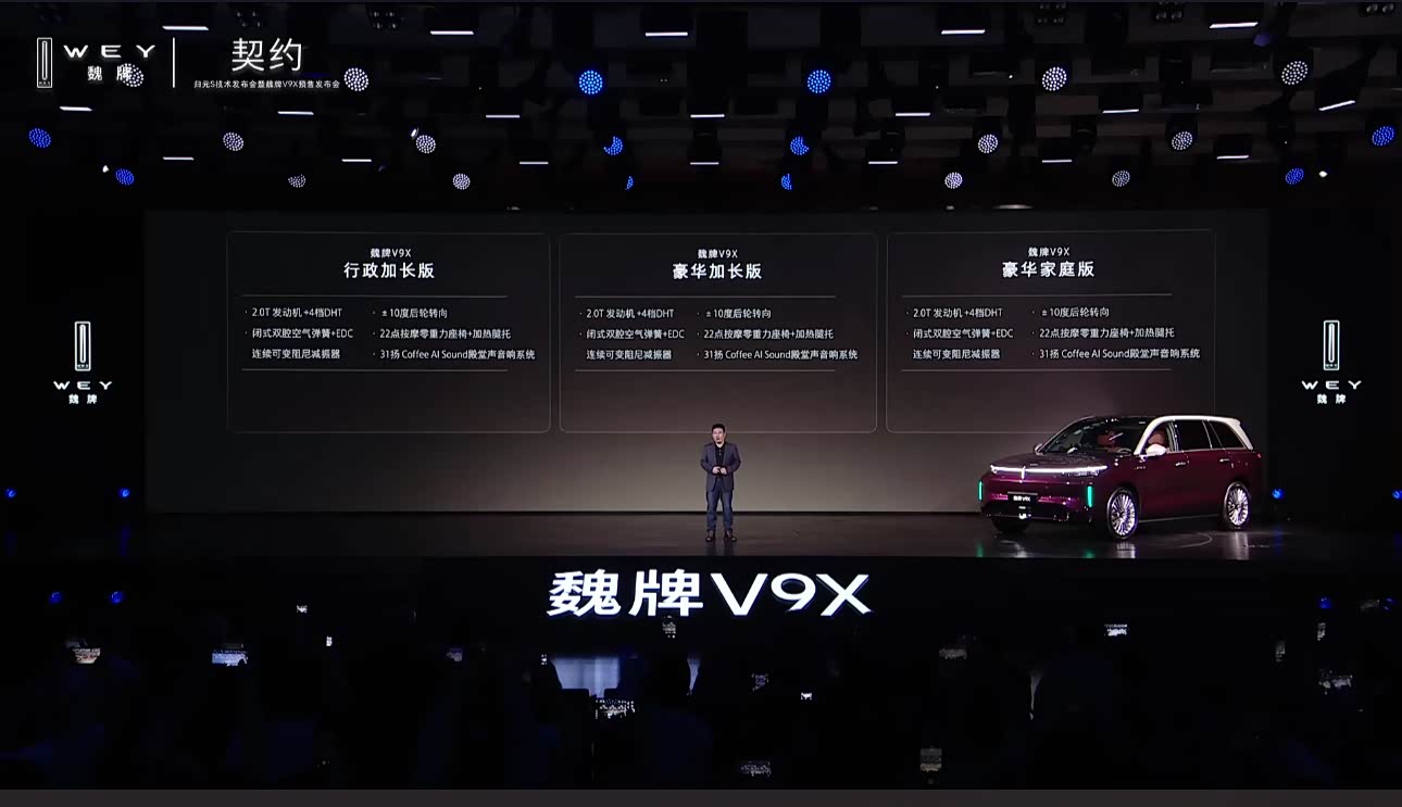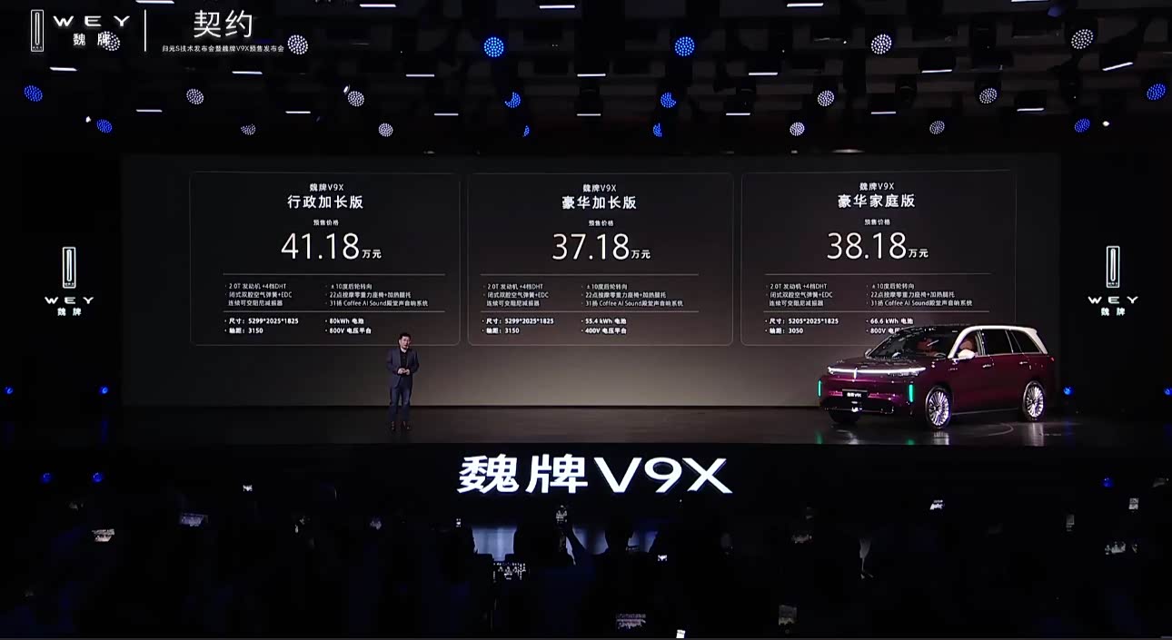 2026年4月17日,长城汽车旗下高端品牌魏牌正式宣布,其基于归元S平台打造的首款旗舰车型——魏牌V9X全面开启预售。新车共推出豪华家庭版、豪华加长版及行政加长版三款配置,预售价区间为37.18万元至41.18万元,以“原生AI”与“极致空间”重塑大型六座SUV市场格局。 此次发布的V9X在尺寸与动力上实现了全面进阶。其中,行政加长版车长达到5299mm,轴距长达3150mm,搭载110kWh超大电池包,配合2.0T发动机与4挡混动专用变速箱,兼顾超长续航与强劲动力。豪华加长版与豪华家庭版则分别以38.18万元和37.18万元的亲民价格,提供5205mm车长及80kWh电池组合,满足不同家庭用户的多元化需求。全系车型均标配Coffee AI Sound高端音响系统及高阶智能驾驶辅助,确保豪华体验不分版本。 技术层面,魏牌V9X依托归元S平台,实现了硬件原子化与AI原生化融合。新车不仅拥有毫秒级响应的AI数字底盘,更通过双VLA大模型实现“主动式”情感交互,能精准识别乘客关系与情绪状态。此外,800V高压平台的加持,让车辆具备极速补能能力,彻底消除里程焦虑。
