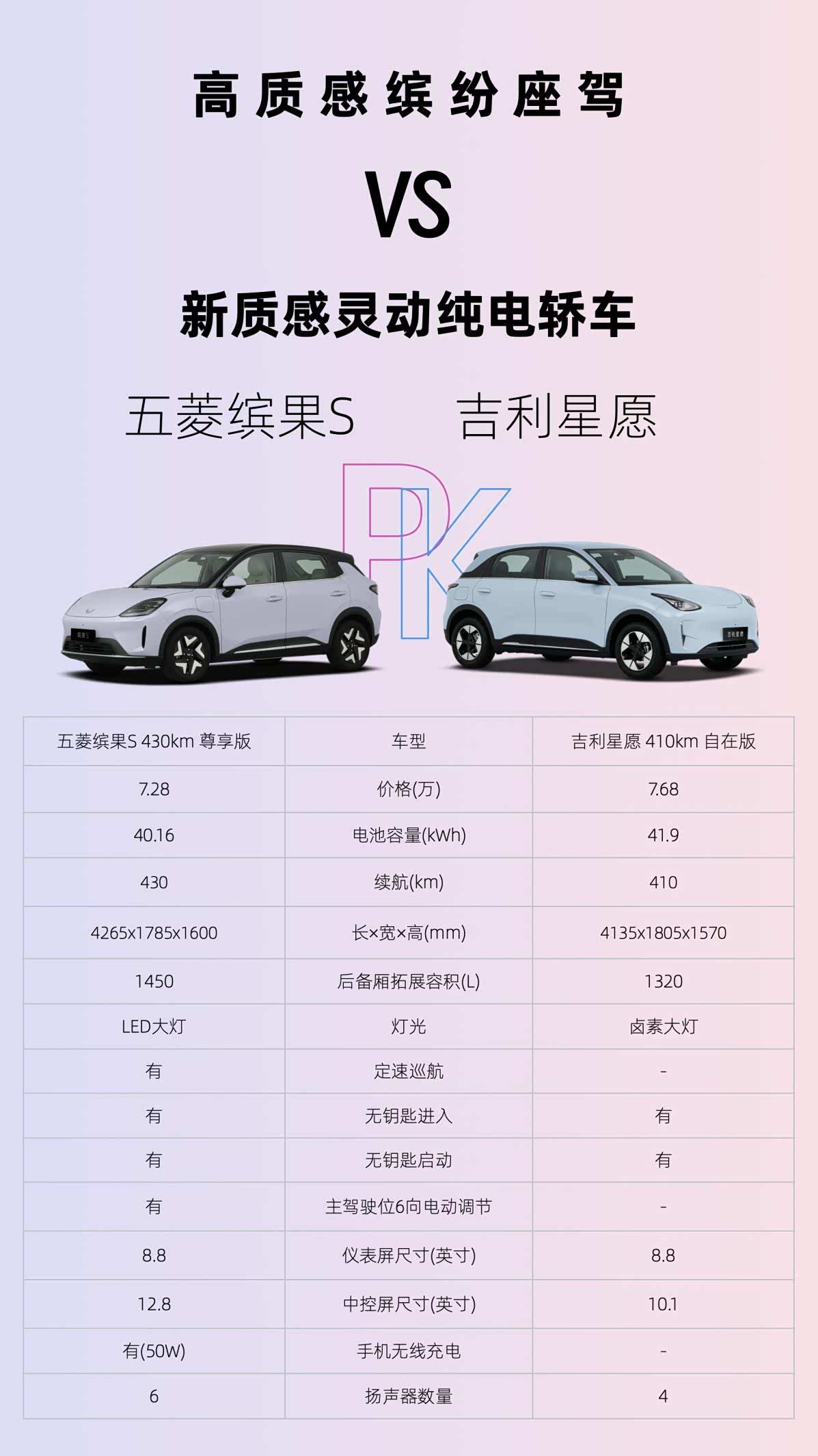 预算7万级入手A0级纯电代步车,选缤果S还是星愿? 结合预算,可以考虑的车型大概是缤果S 430km 尊享款和星愿 410km 自在版。但细抠价格不难看出,缤果S定价比星愿低了4000元,性价比优势更突出。 除了价格,两款7万级纯电代步车给到的出行品质,也存在一定差异。缤果S车长、车高均有优势,后备厢容量也更大。若有家用需求,或时常安排出游、户外露营活动,空间表现更好的缤果S,自然比星愿更加分。 还有配置,缤果S中控屏尺寸做到了12.8英寸,星愿仍是10.1英寸小屏。尽管两台车都配有好用、实用的车机系统,但结合屏幕大小给出的操作反馈来看,缤果S综合表现更好一些。 并且,缤果S还配有50W手机无线充电、主驾6向电动调节、定速巡航等功能,这些都是同价位星愿没有的。包括纯电续航,便宜了4000元的缤果S,反而有长过星愿的430km续航,这一点也足以证明缤果S性价比。 所以,当预算卡在7万级,纠结缤果S和星愿时,我认为性价比可观、产品体验更香的缤果S,比星愿更值得考虑。