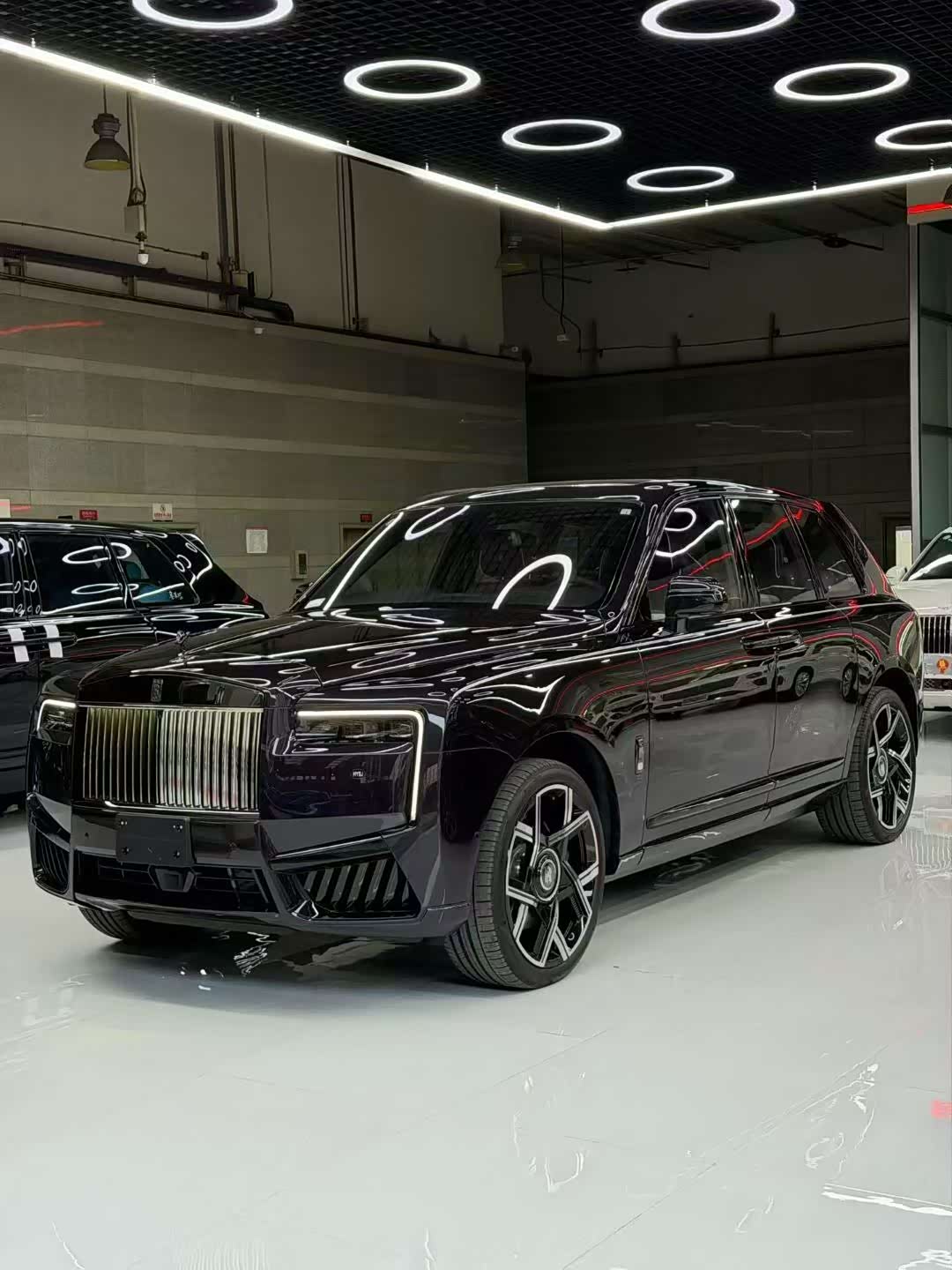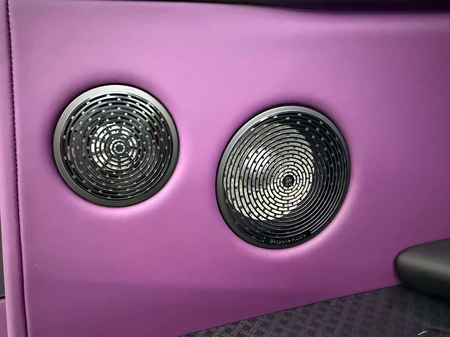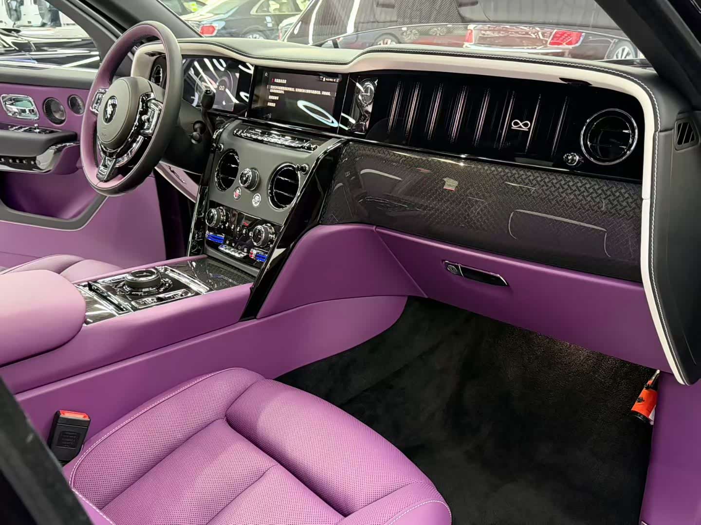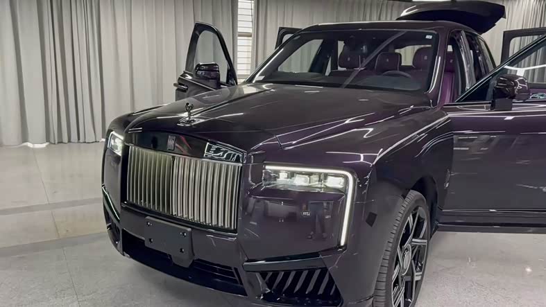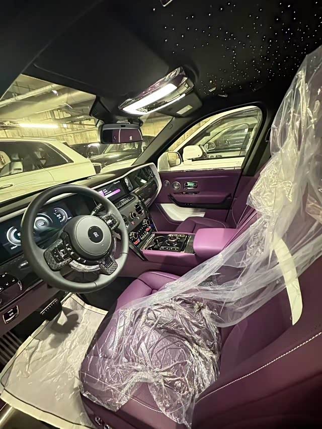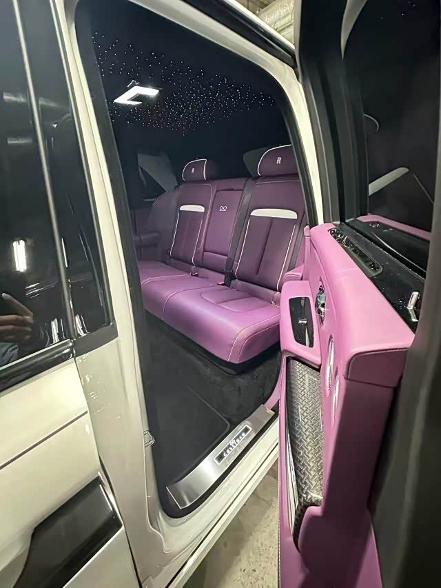 26款劳斯莱斯库里南BB 颜色:贝拉多纳紫(颠茄紫)/定制紫 配置:4座 流星顶 (白色)双腰线 23寸轮毂 轮毂盖白色镶边 发光面板 双色方向盘 增强时钟 后排娱乐 定制音响 定制羊毛脚垫 定制钥匙 定制雨伞。