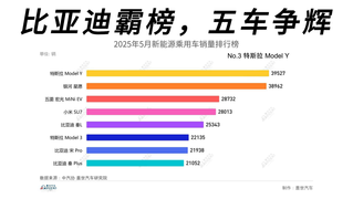 2025年5月新能源乘用车销量TOP10:比亚迪霸榜,五车争辉