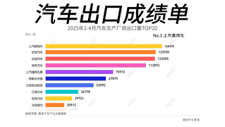 汽车出口成绩单:2025年1-4月汽车生产厂商出口量TOP20