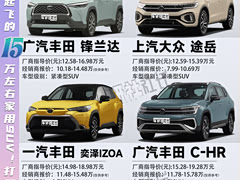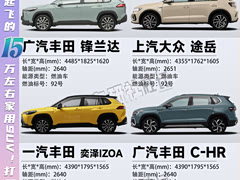 💰省油到起飞的15万左右家用SUV!打工人首选! 一汽丰田 卡罗拉锐放 厂商指导价:13.98-16.98万 经销商报价:9.98-12.98万 发动机:2.0L 171马力 L4 变速箱:CVT无级变速(模拟10挡) 长*宽*高/轴距(mm):4460*1825*1620/2640 一汽-大众 T-ROC探歌 厂商指导价:15.89-17.99万 经销商报价:9.98-13.99万 发动机:1.4T 150马力 L4 变速箱:7挡干式双离合 长*宽*高/轴距(mm):4336*1819*1592/2680 广汽丰田 C-HR 厂商指导价:15.28-19.28万 经销商报价:11.78-15.78万 发动机:2.0L 171马力 L4 变速箱:CVT无级变速(模拟10挡) 长*宽*高/轴距(mm):4390*1795*1565/2640 一汽丰田 奕泽IZOA 厂商指导价:14.98-18.98万 经销商报价:11.48-15.48万 发动机:2.0L 171马力 L4 变速箱:CVT无级变速(模拟10挡) 长*宽*高/轴距(mm):4390*1795*1565/2640 上汽大众 途岳 厂商指导价:12.59-15.39万 经销商报价:7.99-10.69万 发动机:1.5T 160马力 L4 变速箱:7挡干式双离合 长*宽*高/轴距(mm):4355*1762*1605/2651 广汽丰田 锋兰达 厂商指导价:12.58-16.98万 经销商报价:10.18-14.48万 发动机:2.0L 171马力 L4 变速箱:CVT无级变速(模拟10挡) 长*宽*高/轴距(mm):4485*1825*1620/2640