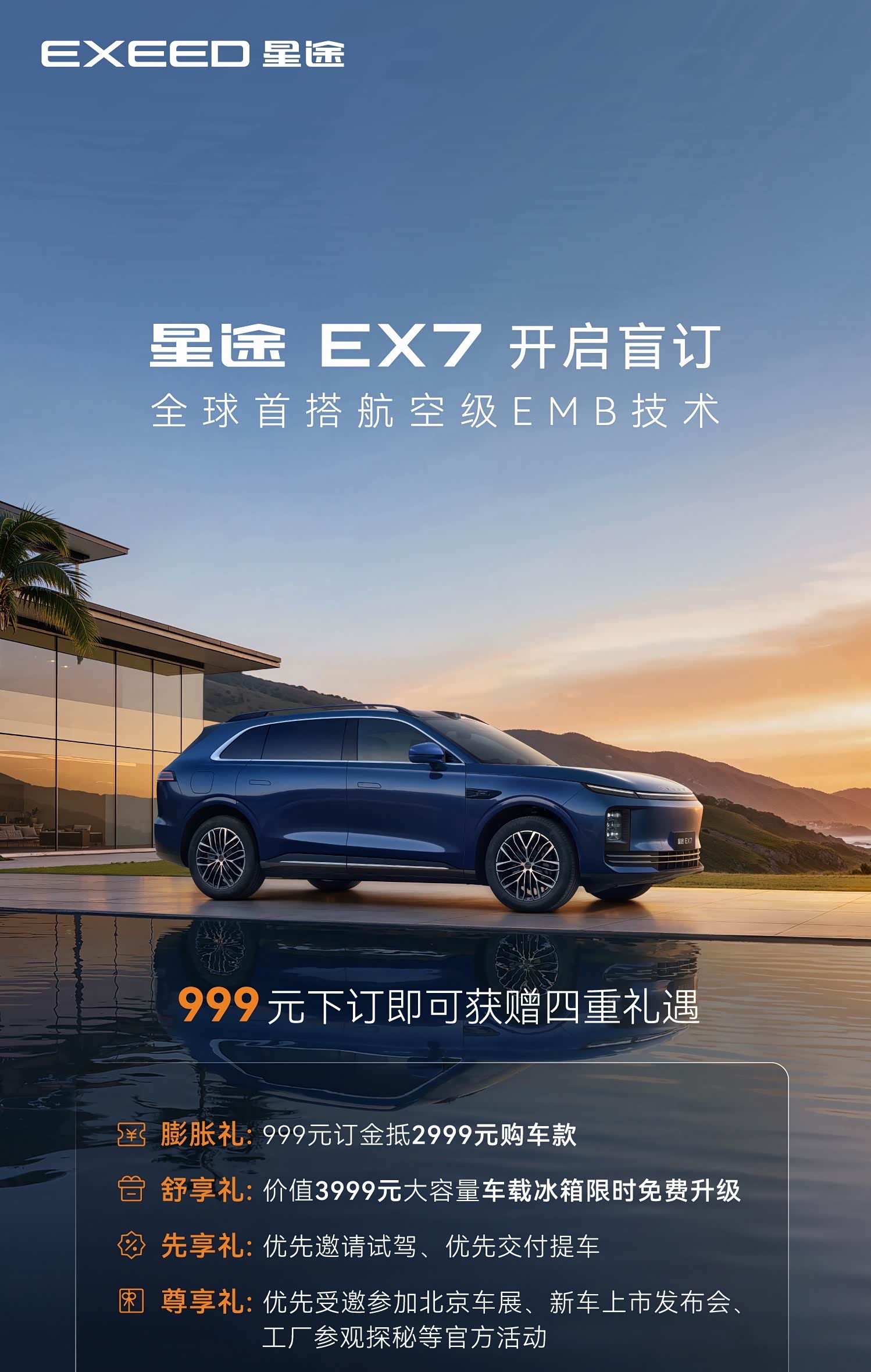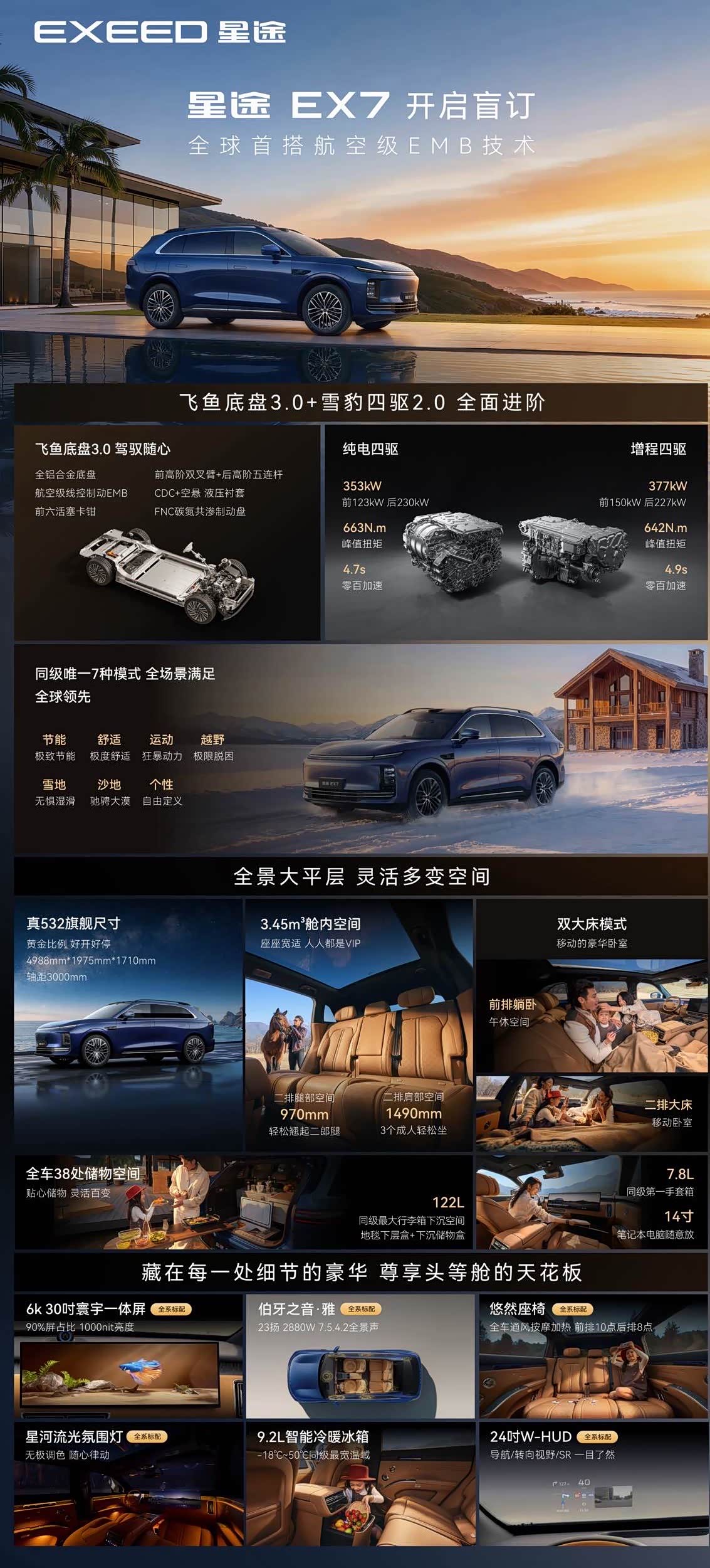 今晚,奇瑞集团“电池之夜”,星途EX7正式亮相,并同步开启新车盲订。这款定位“中式豪华7系”的智能大五座SUV,以首发航空级EMB线控制动技术,标志着线控制动技术正式进入大规模量产阶段。 技术突破:从液压到线控的跨越 EMB(电子机械制动)技术完全摒弃了传统液压制动管路,通过电信号直接控制制动卡钳,实现了制动系统的全面电子化。相比传统液压制动,EMB的响应速度提升至90毫秒级别,制动距离得到优化。该系统采用双冗余安全设计,在主系统失效时备用系统仍可提供完整制动力,为高阶智能驾驶提供了可靠的执行保障。 双重价值:安全基石与性能拓展 EMB技术的价值体现在两个核心维度:智能驾驶安全与豪华性能体验。 EX7提供纯电与增程双动力,其中增程版综合续航突破1500公里,纯电版基于800V高压平台打造。智能座舱搭载高通8295P芯片与灵犀智舱2.0系统,高配车型提供CDC电磁悬架与空气悬架组合。 EX7以“中式豪华7系”为定位,瞄准20万-30万元主流SUV市场,目前已经开启盲定,估计北京车展会正式亮相!#大V聊车#