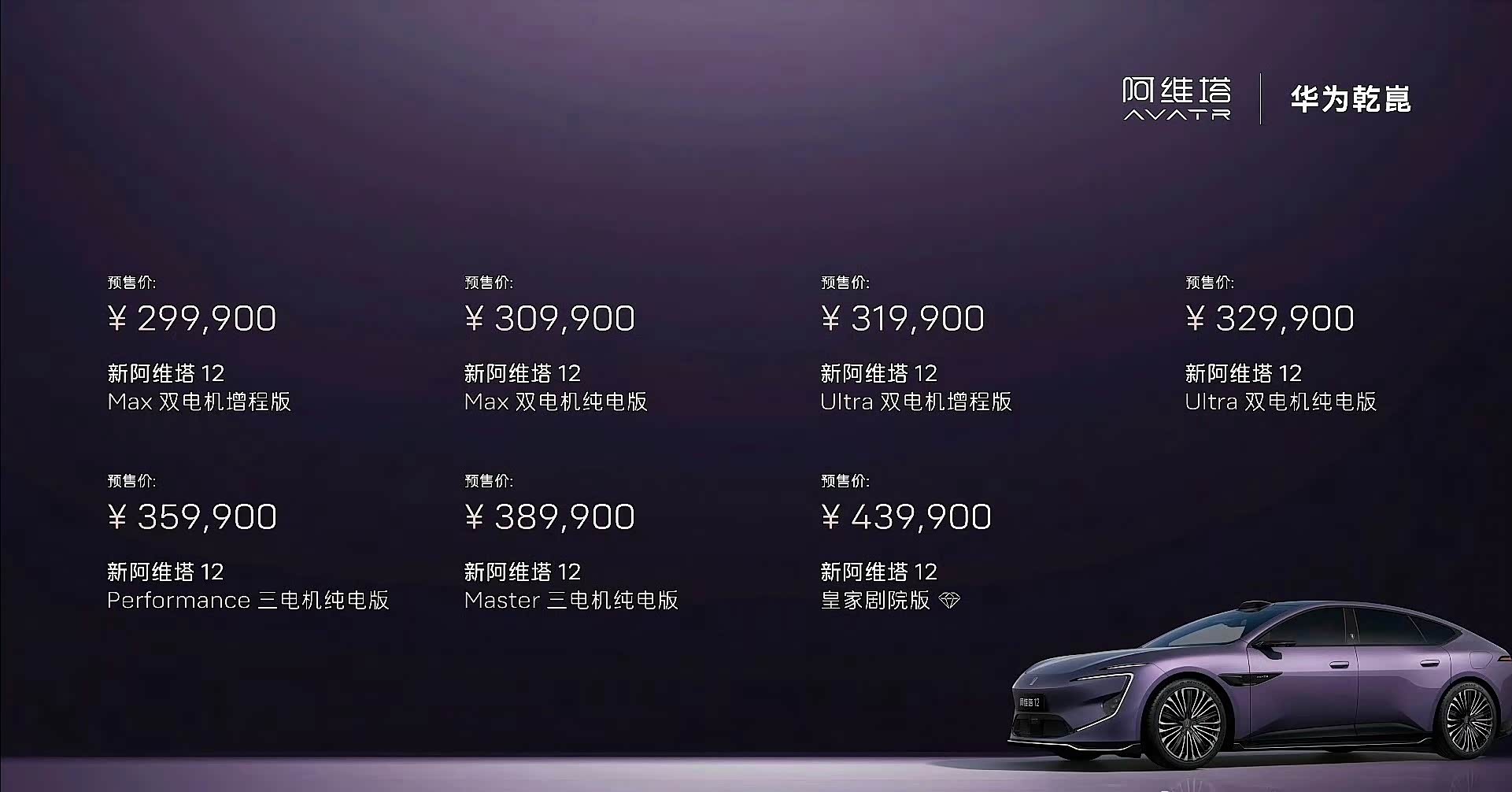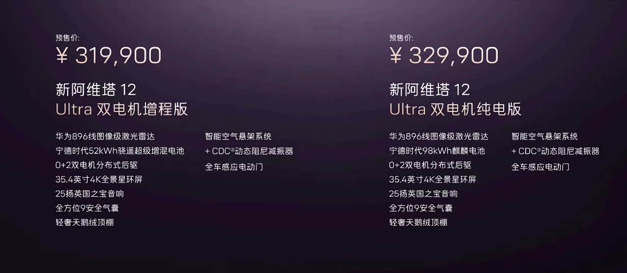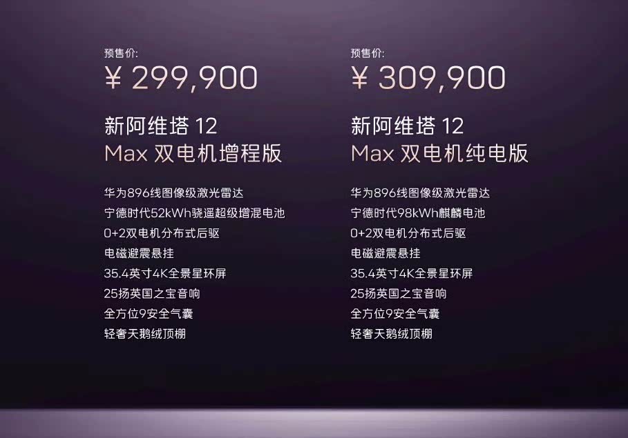 新阿维塔12开启预售29.99万元起,全系标配乾崑四激光方案与896线激光雷达。 搭载的华为乾崑新四激光方案,通过全球量产最高的896线双光路图像级激光雷达与分布式传感器系统,将智驾感知能力提升至行业新高度,尤其在极端场景下的安全性与通行效率 一、硬件配置:全域感知能力跃升 新车全系标配4颗激光雷达(3颗长距+1颗后向高精度固态雷达),实现360°无死角覆盖。其中顶置的896线双光路图像级激光雷达为全球量产最高规格,分辨率较普通方案提升400%,可精准识别150米外碎石、悬空障碍物及夜间盲区微小目标。 二、智驾性能:全场景安全与效率 主动预判:896线激光雷达在掉头车入侵车道、夜间山路盲区、电动车“鬼探头”等场景下,提前识别风险并柔和绕行,避免急刹或猛躲。 避障能力:实测中成功避让低矮障碍物(如钉子狼牙棒、倒地假人)、动态目标(黑狗与小猫)及突发障碍(弯道停车车辆),响应速度优于人眼。 华为乾崑智驾ADS 4基于WEWA架构,端到端时延降低50%,支持高速/城区/泊车NCA全程无断点。可精准识别复杂匝道、特殊车道标识及ETC收费站,通行效率提升20%,重刹率下降70%。