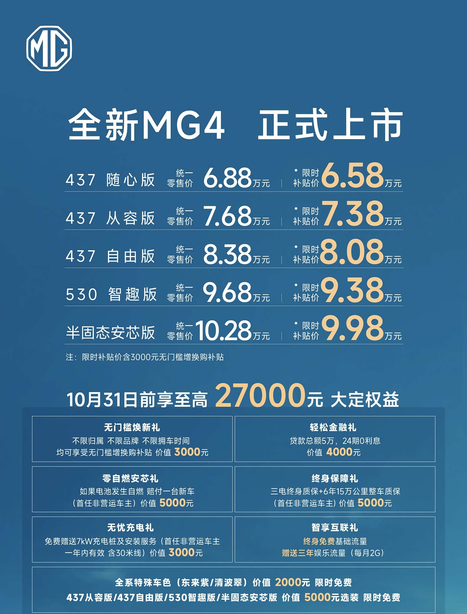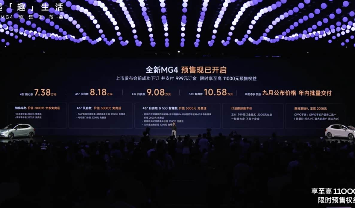 今晚全新MG4 开启预售,半固态电池加持,7.38万—10.58万,和OPPO合作开发手车互联系统亮相! 全新MG4提供了6种车色和2种内饰,继续主打年轻/风尚/智趣的标签,作为首个搭载上汽和OPPO合作开发的手车互联系统的品牌及车型,这是上汽和OPPO的New Opportunity,也是MG4的New Opportunity。 此次发布会,OPPO还官宣将与上汽集团合作探索全新渠道模式,OPPO 手机上车 MG,互联体验等我体验 回到新车,全新 MG4 续航也超给力, 530km 续航,特别在冬天,全新 MG4 在-7°低温下,热车续航达成率达 75%,相比行业平均水平高出 20%。同时全新 MG4 采用了同级唯一的 CTB 车身电池⼀体化技术。在 10 万元左右的同级产品中,都没能使⽤ CTB 架构,但 20万甚至 30 万级别的车型,普遍都采用了 CTB 技术。采用的半固态电池,真正实现了零下 20 度甚至更低的极低温环境下,电池充的进,开的了!这对北方客户而言,太棒了! 全新的 MG4,价格不错,期待正式发布!
