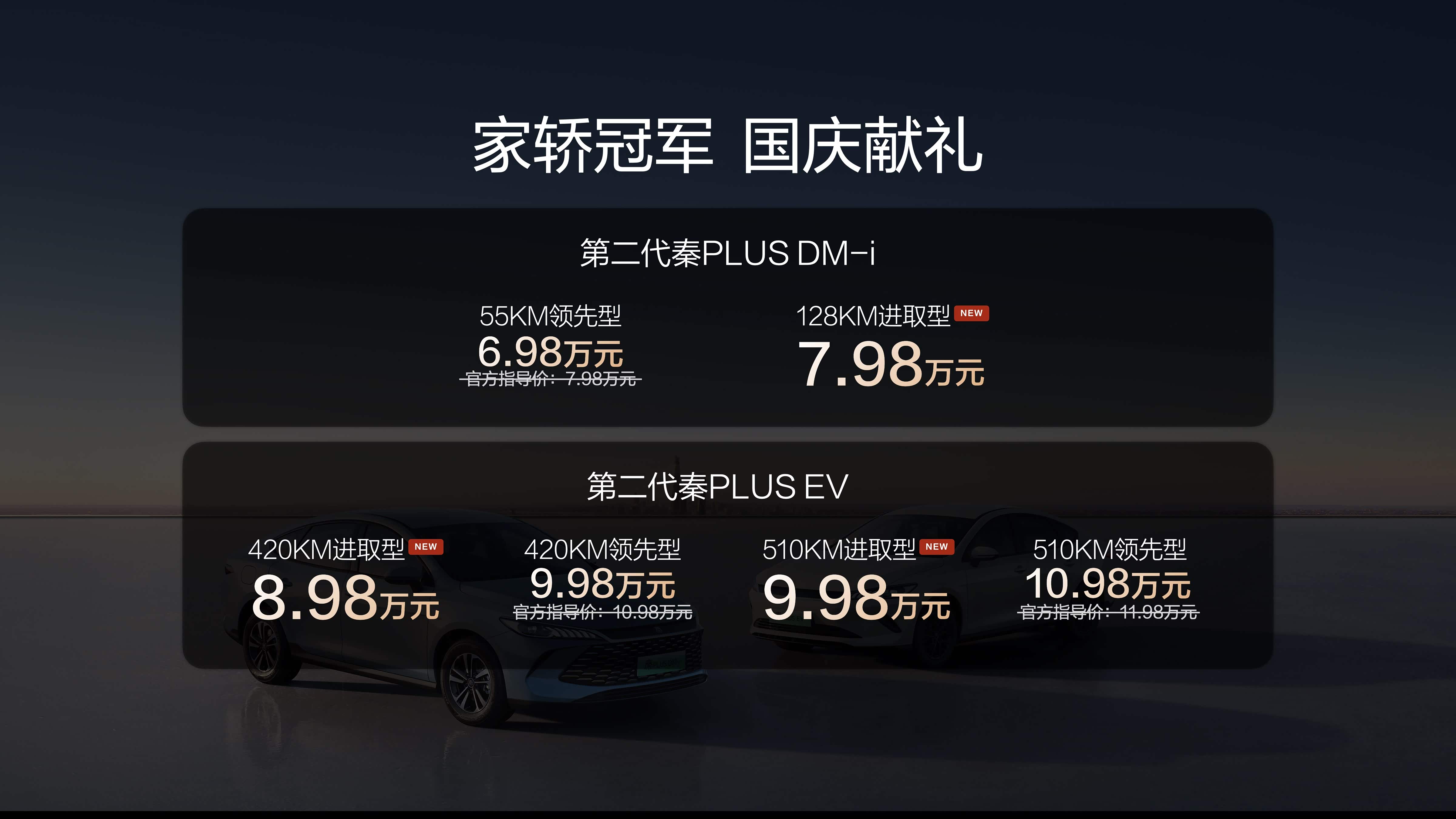 趁着国庆假期前,比亚迪献了一波大礼,第二代秦Plus DM-i与秦Plus EV双双推新,秦Plus DM-i上新了128KM进取型,把价格干到了7.98万,55KM领先型国庆献礼价更是直接到了6.98万,EV版的420KM进取型和510KM进取型价格分别为8.98万和9.98万,不亏是A级轿车引领者,这力度属实是大。 值得注意的是,第二代秦Plus DM-i通过OTA将NEDC百公里亏电油耗降到了2.69L,谁能想到车子越开油耗还能越低,不愧是节能省油全球王者典范。 其他方面的升级也挺多,新加推的星河米配色非常时尚,怀挡设计提升了换挡便利性,NFC车钥匙、车载ETC等功能也都是标配,足够有诚意了,秦Plus绝对是A级家轿的标杆之作,经济实用配置齐全,各位可以趁着假期到门店实际看一下。
